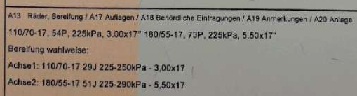 Zu den Reifen. Gemäß korrekt nach CoC ausgefülltem Fahrzeugschein sind vorne 110/70-17 54P und hinten 180/55-17 73P zugelassen.