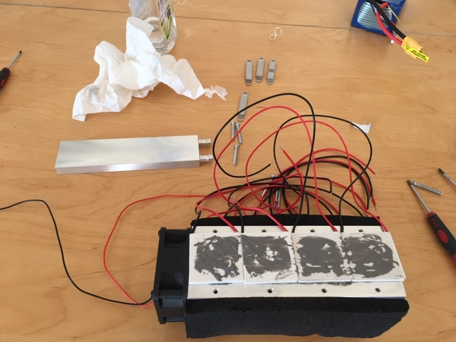 Die kühle Seite des Petiers ist mit dem Alukästchen verbunden und überträgt die Kälte auf diese zwei Behälter. Durch die fließt dann das Kühlmitel.