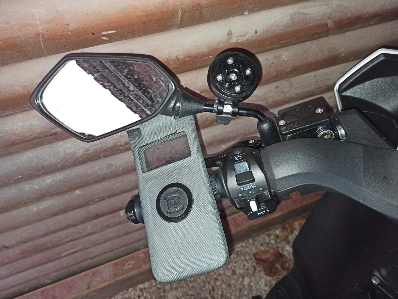 An dem linken Spiegel habe ich eine Smartphone-Halterung mit patentiertem Dreh-Schnellverschluss (s. SP Connect Moto Bundle). Außerdem habe ich die Standardverbindung durch das Anti-Vibrationsmodul erweitert - wie oben schon erwähnt gibt es einschlägige Erfahrungen, dass insbesondere die Kameras von IPhones durch die starken Vibrationen Schaden nehmen können. Das Anti-Vibrationsmodul dämpft hinreichend, so dass keine Schäden mehr auftreten sollen.