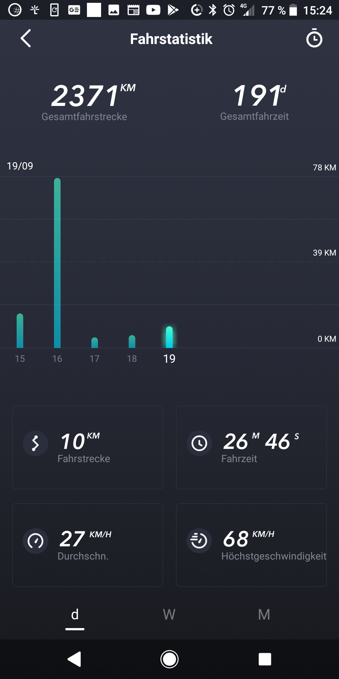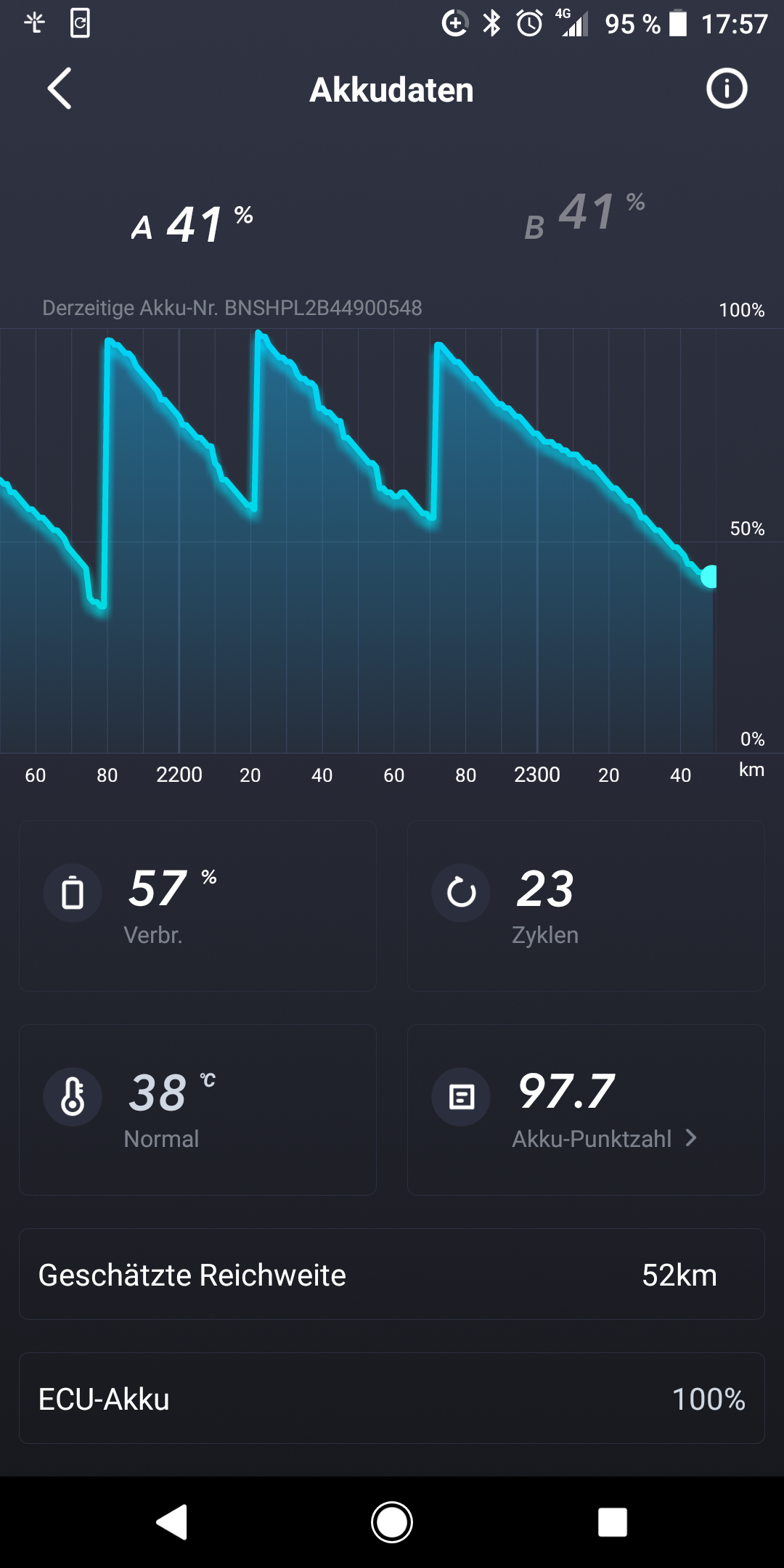 Ich hab am mittwoch vergangener Woche den Roller geladen, bis auf 98 % ( zu mehr hat die Zeit nicht gereicht ) und hab dann eine längere Strecke von 78 km gefahren. Über Kreisstrassen, geteerte Wingertwege und Bundesstrassen 40 km hin und 38 zurück bei einem Verbrauch von 57 % Akkuleistung. Alles im Sportmodus aber logischer Weise nicht immer am Anschlag ! Dann hab ich von Do bis heute früh durch kürzere Fahrten, die allerdings alle im Dynamik-Modus, die 100 km Strecke vollgemacht und hab noch 25 % Akku ! Ein bisschen Drift zwischen A und B das werden aber bei dem niedrigen Ladungsstand nur wenige Millivolt sein, ich habs nicht gemessen !