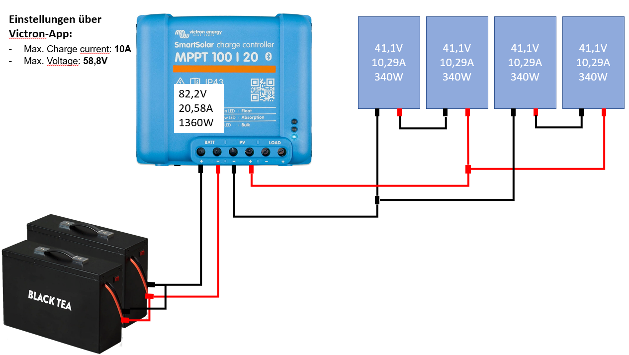 Die oben genannte Möglichkeit mit Victron-Laderegler ist natürlich wesentlich besser als das Chinateil. Der Victron lässt sich ja schön einstellen und hält sich auch an die Vorgaben (habe die kleinere Version im Womo). Man könnte die Akkus auch parallel Laden und müsste dann nicht auf 10A begrenzen.