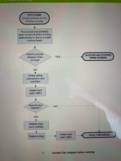 Wie auch Dein Dokument zeigt, deutet dieser Fehler eigentlich auf einen festgeklebten Kontakt im Fahrstromschütz hin, kann aber auch erscheinen, wenn man die Zündung bei sich drehendem Rad ausschaltet (es reicht, wenn der Roller langsam rollt, oder das Hinterrad im aufgebockten Zustand dreht.