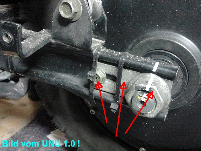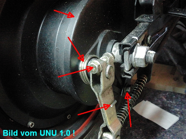- Teile der Trommelbremse lösen/entfernen (Deckel später) - auf beiden Seiten die Halteschrauben, Unterlegplatte und Radmuttern lösen - der UNU 2.0 hat noch jeweils eine Kontermutter, entfernen !