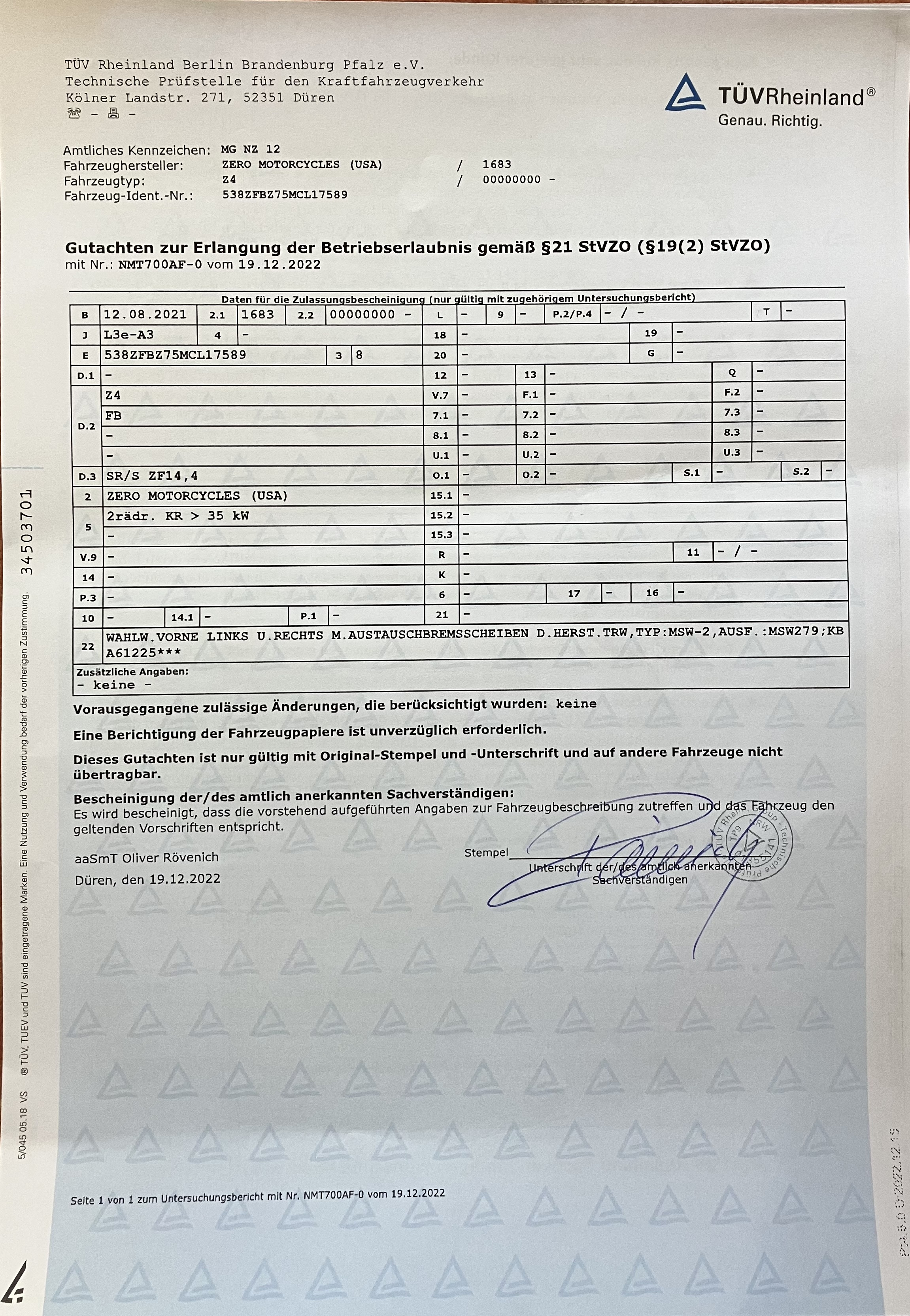 Hmmm, hat da der TüV sein Pfründe in Sicherheit gebracht mit dem Satz: "Dieses Gutachten ist nur gültig mit Original-Stempel und -Unterschrift und auf andere Fahrzeuge nicht übertragbar."