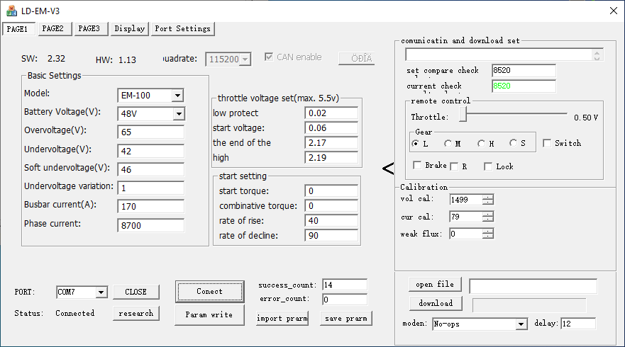 Ich vermute, dass nach einem Klick auf "Conect" die Parameter vom Controller gelesen werden, jedoch nicht ständig und dauerhaft, "success count" steigt nur nach dem Knopfdruck. Aber auch so bekomme ich keine Anzeigen von Speed, Drehzahl und Throttle aktualisiert, genau wie bei Rudi.