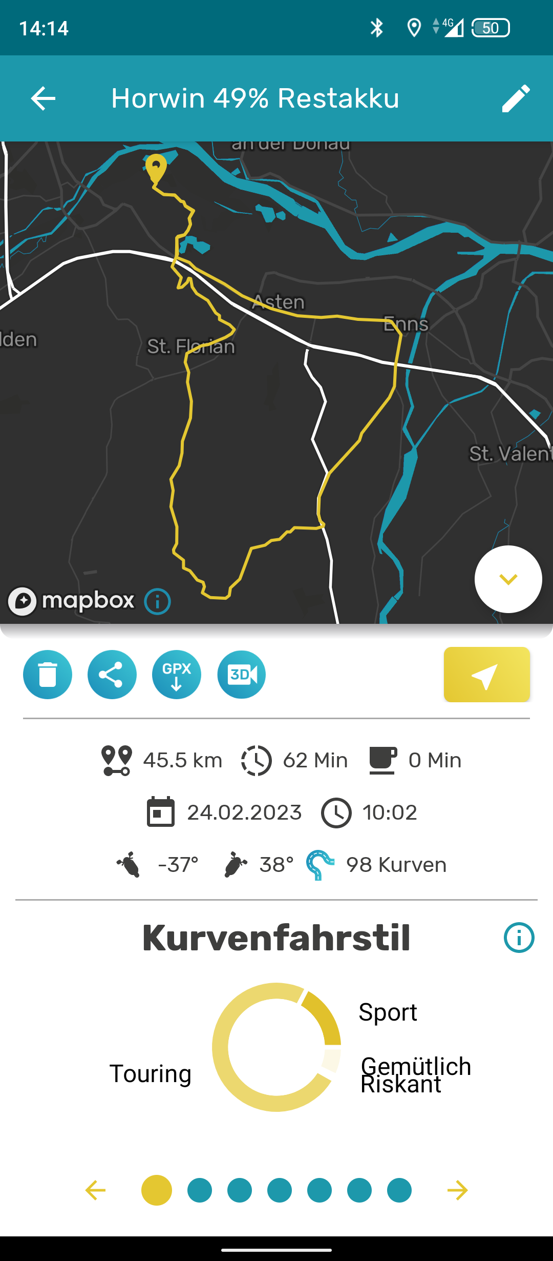 Heute zweite Runde: 14,4 km. Temp 5°C. Sightseeing Tour. Schnelle Anfahrt. Dann Serpentinen geschmeidig (50km/h) Berg hochfahren, dann langsam Hoppelstrecke (Geschwindigkeitsschweller) mit Rekuperation gebremst, wieder runtergefahren und durch Ort zurück.