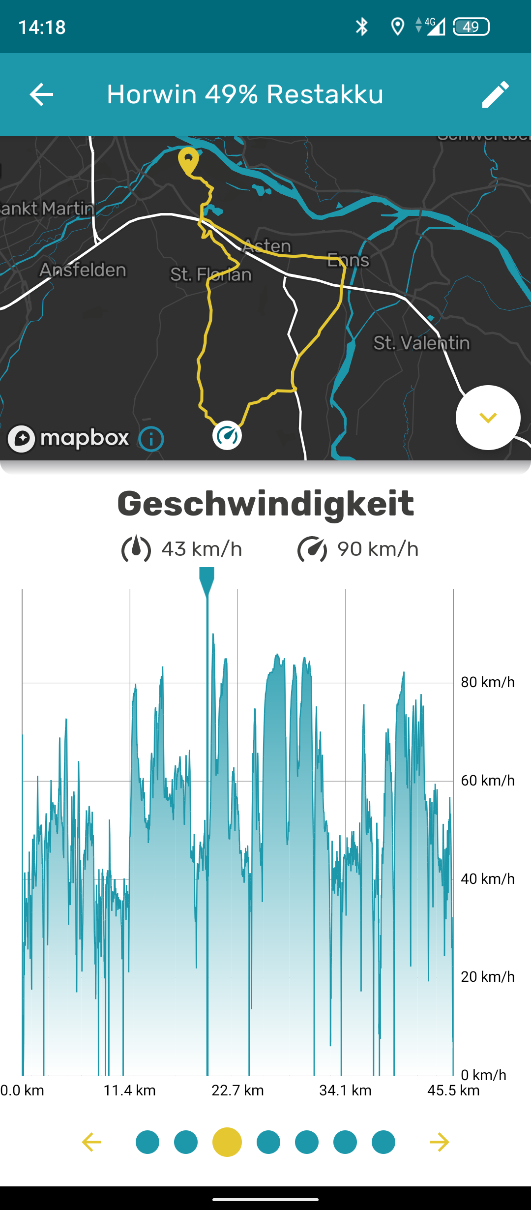 Mit vollem Akku gestartet: nach 19,1 km noch 20% ergibt eine max Reichweite von 23km oder mit 5% Restakku 22,7 km. (WTF?)