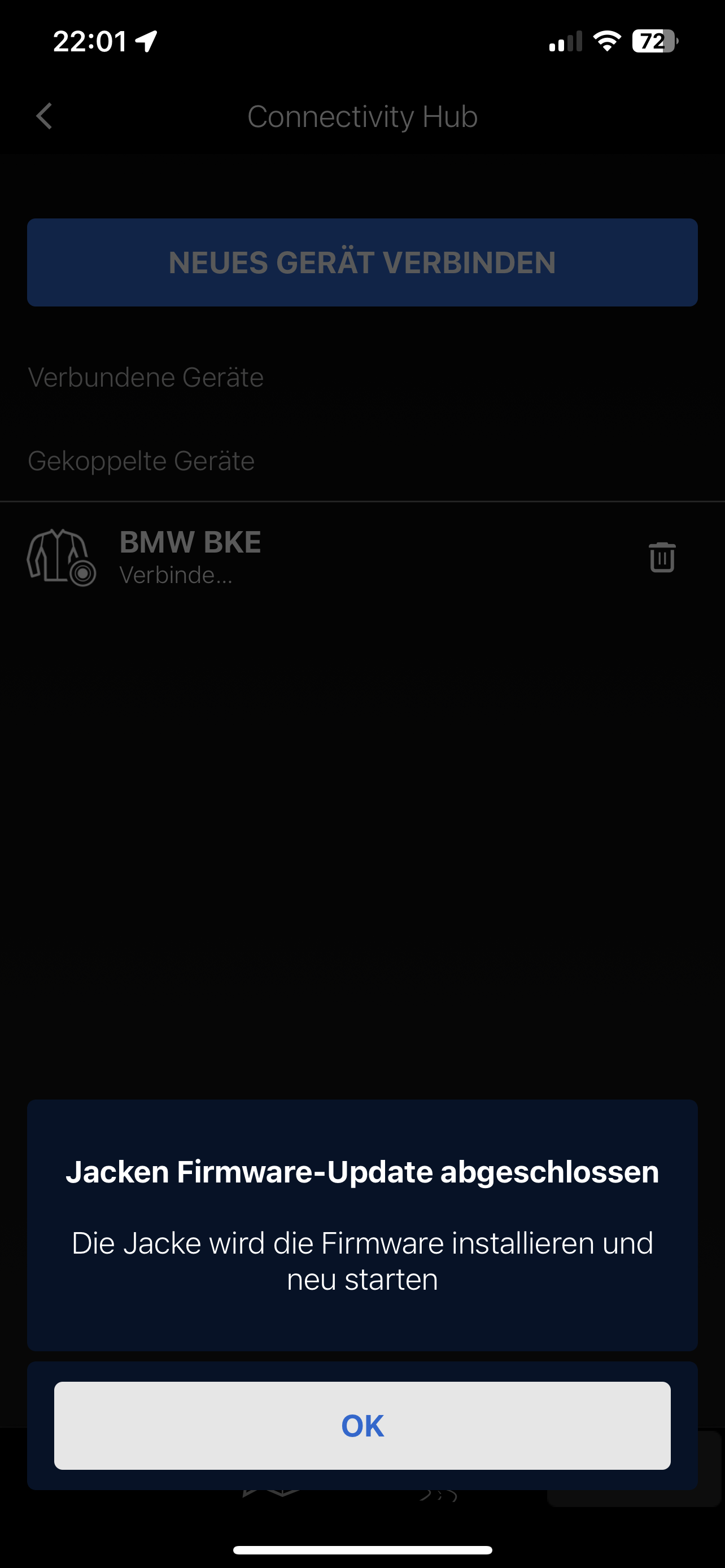 Bild zeigt Info zum verbundenen Gerät BMW Jacke in diesem Fall ist die Farbe Rot eingestellt Bild zeigt Setting zu Einstellung was geschehen soll wenn man lange auf das Steuerpad drückt Hier das Softwareupdate (klappte einwandfrei und schnell) Farbeinstellungen können 4 an der Zahl nach belieben abgespeichert und später abgerufen werden Connectivity-HUB mit verbundener Jacke Habt Ihr noch Fragen
