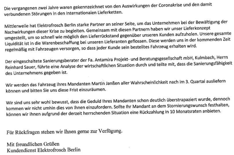 keiner der Händler von Elektro Frosch kennt die neue Kiste, keiner hat Daten oder je was von gehört, mit 3 Händler heute telefoniert... Die sagen alle das die Pleite sind und nur mit der neuen Kiste noch ein bisschen Kohle kassieren wollen... Habe mal gezählt, ich habe insgesamt 87 Anfragen per Mail gesendet und keine Reaktion erhalten. Mein Anwalt hat mit deren Anwalt Kontakt, da kommt immer nur das man sich bis zum 12.05.2023 gedulden solle... Nach meiner Einschätzung kommt dann der Insolvenz Onkel und macht DICHT... Traurig traurig und echt schade um die lustigen Fahrzeuge...