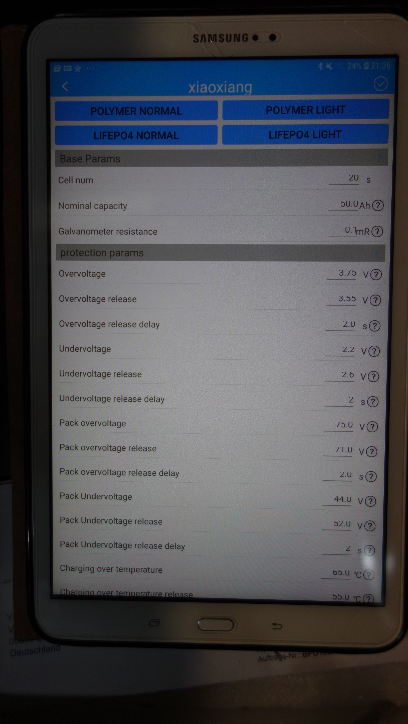 Danke für die Infodominik hat geschrieben: So 7. Jul 2024, 22:14 Das cell over voltage wäre mir mit 3,75V etwas zu hoch. Das Üack overvoltage mit 75V auch.
