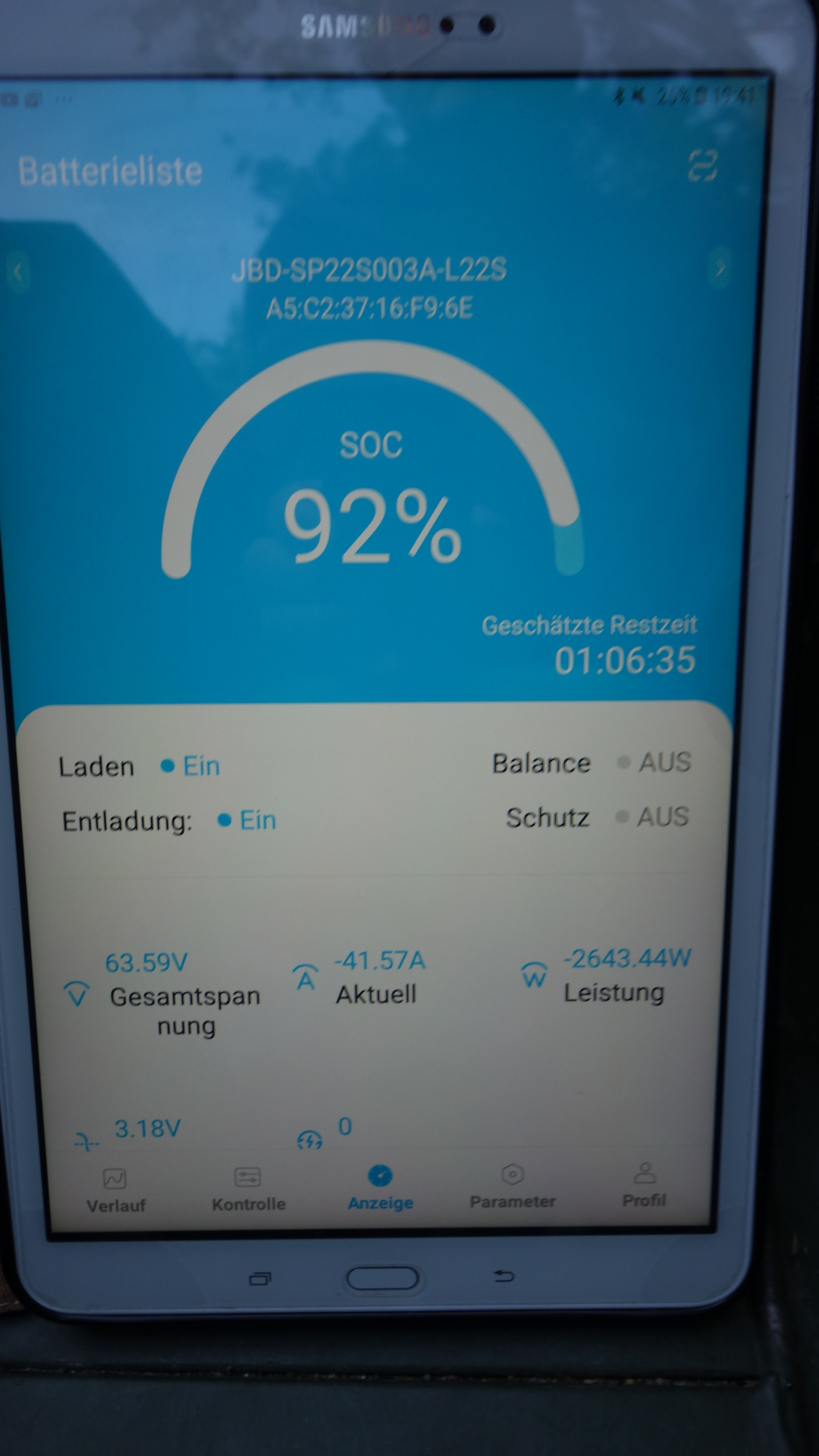 Der Akku ist noch einwenig debalanciert. Deswegen erreichst du auch keine 72V. Leider hat das JBD/Xiaoxiang BMS nur einen geringen Balancerstrom von 35mA. Jedenfalls hat die Abschaltung durch das BMS bei 3,6V, Zelle 3, funktioniert. Vermutlich wirst du, auch nach mehreren Ladevorgängen, nur auf 70V Ladeendspannung kommen. Das ist aber nicht schlimm - ist halt bei einem LFP-Akku so.