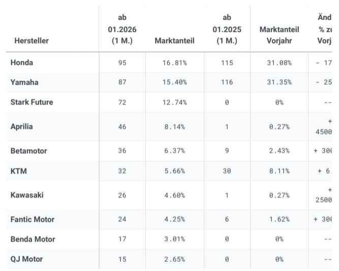 ... nur gesehen habe ich noch keine!?!Nova hat geschrieben: Di 17. Feb 2026, 17:56 Stark über 50% Marktanteil bei Elektroleichtkrafträdern im Januar 2026...