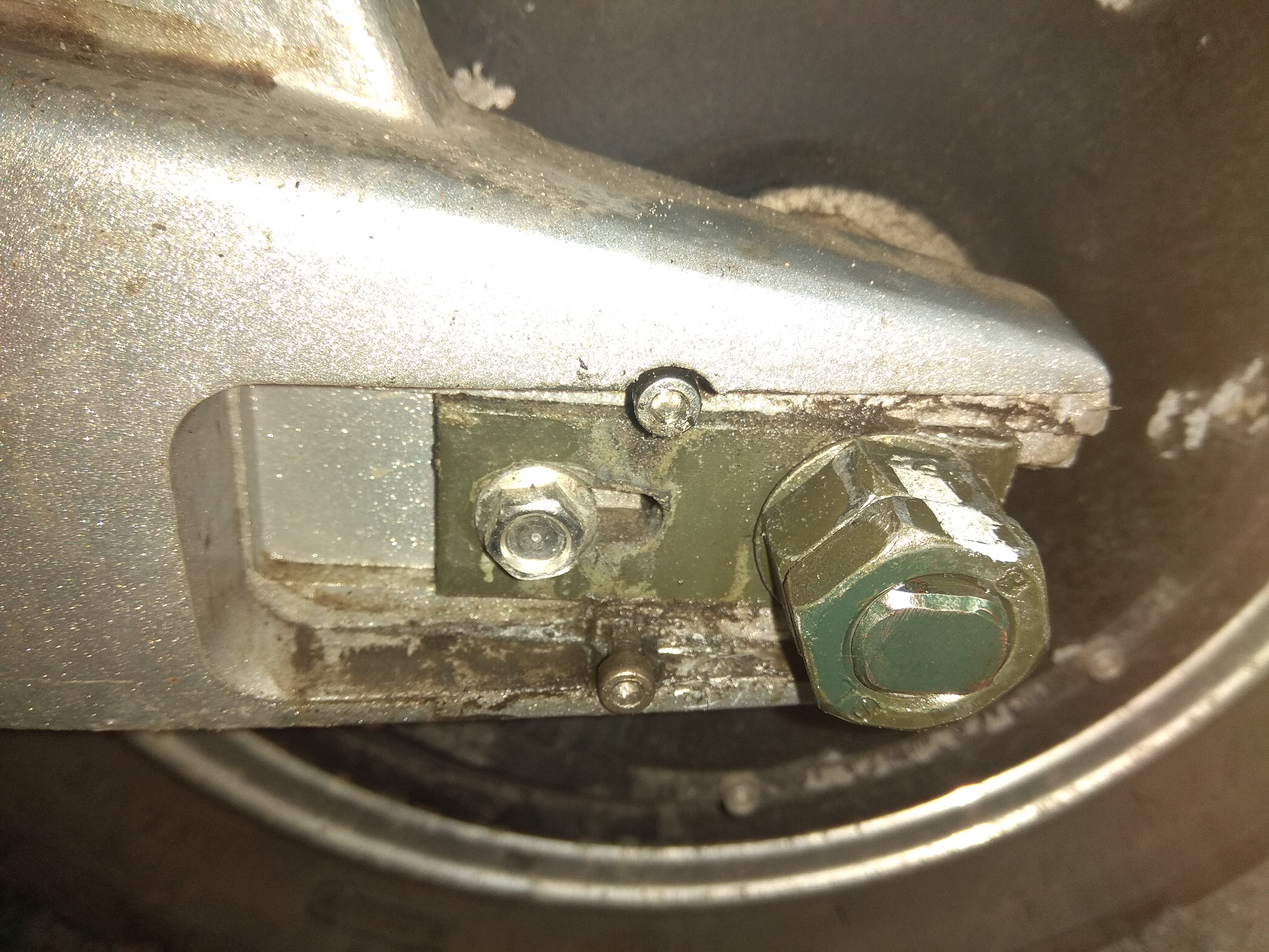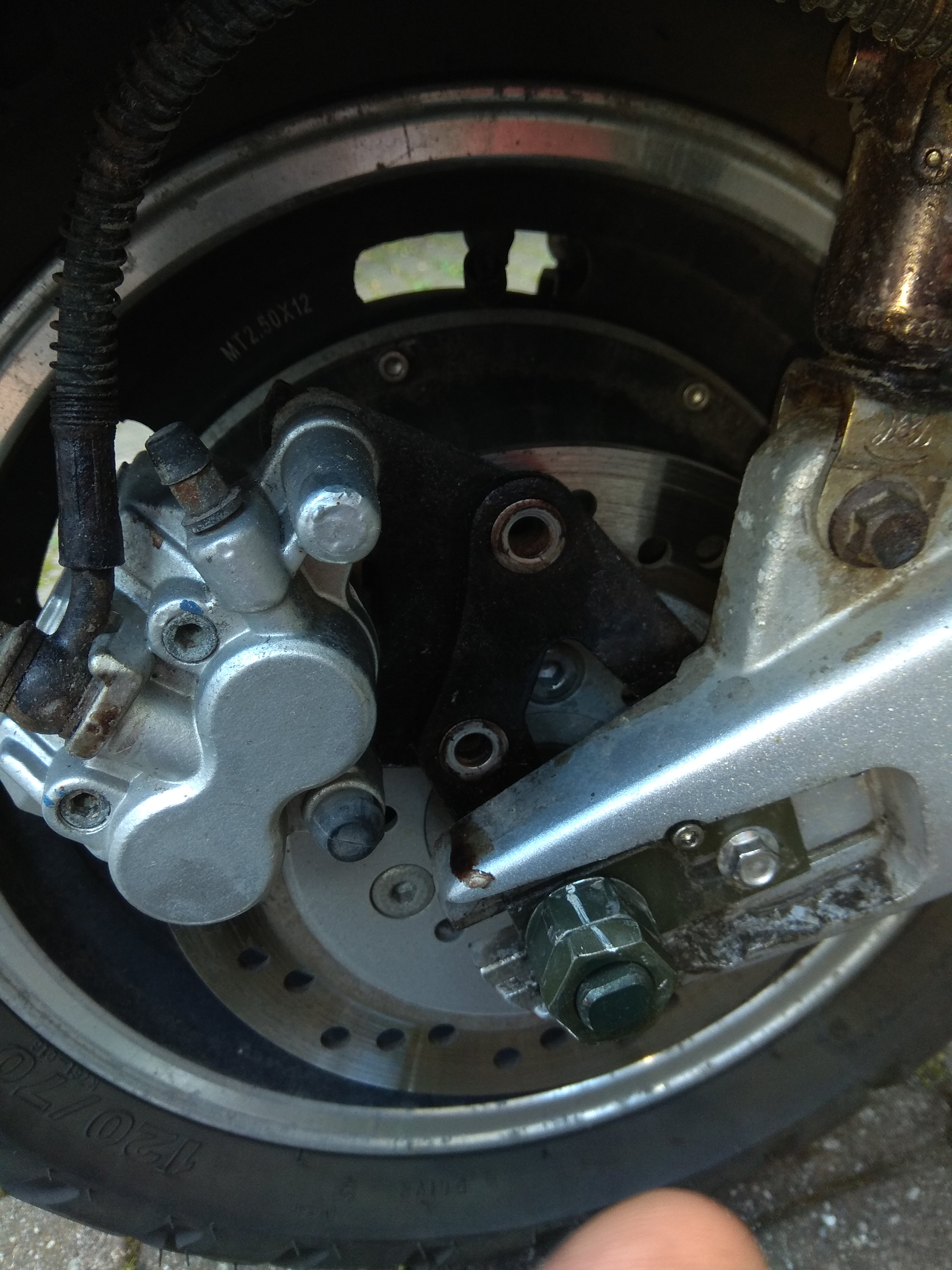 Bremse lies sich abbauen, aber auf jeder Seite zwei 3mm Imbus Schrauben, die die Abdeckungen der hinteren Welle festhalten, liessen sich nicht lockern. Nach Anwendung von reichlich WD40 habe ich bei dann beim Rausdrehversuch bei einer den Kopf abgedreht (d.h. Schraube geloest) und bei den anderen 3 nur den Kopf ausgeleiert. Ich hatte dann keine Lust mehr und habe Methode "Und bist du nicht willig, so brauch ich Gewalt angewandt" und die Abdeckungen einfach mit dem Schraubenzieher runtergehebelt. Die sind nur zur Schoenheit und haben nach hinten eh ein Loch, d.h. sie schuetzen sowieso nur vor groben Dreck. Ich werde sie einfach mit Gaffa-Tape oder aehnlich wieder festmachen.