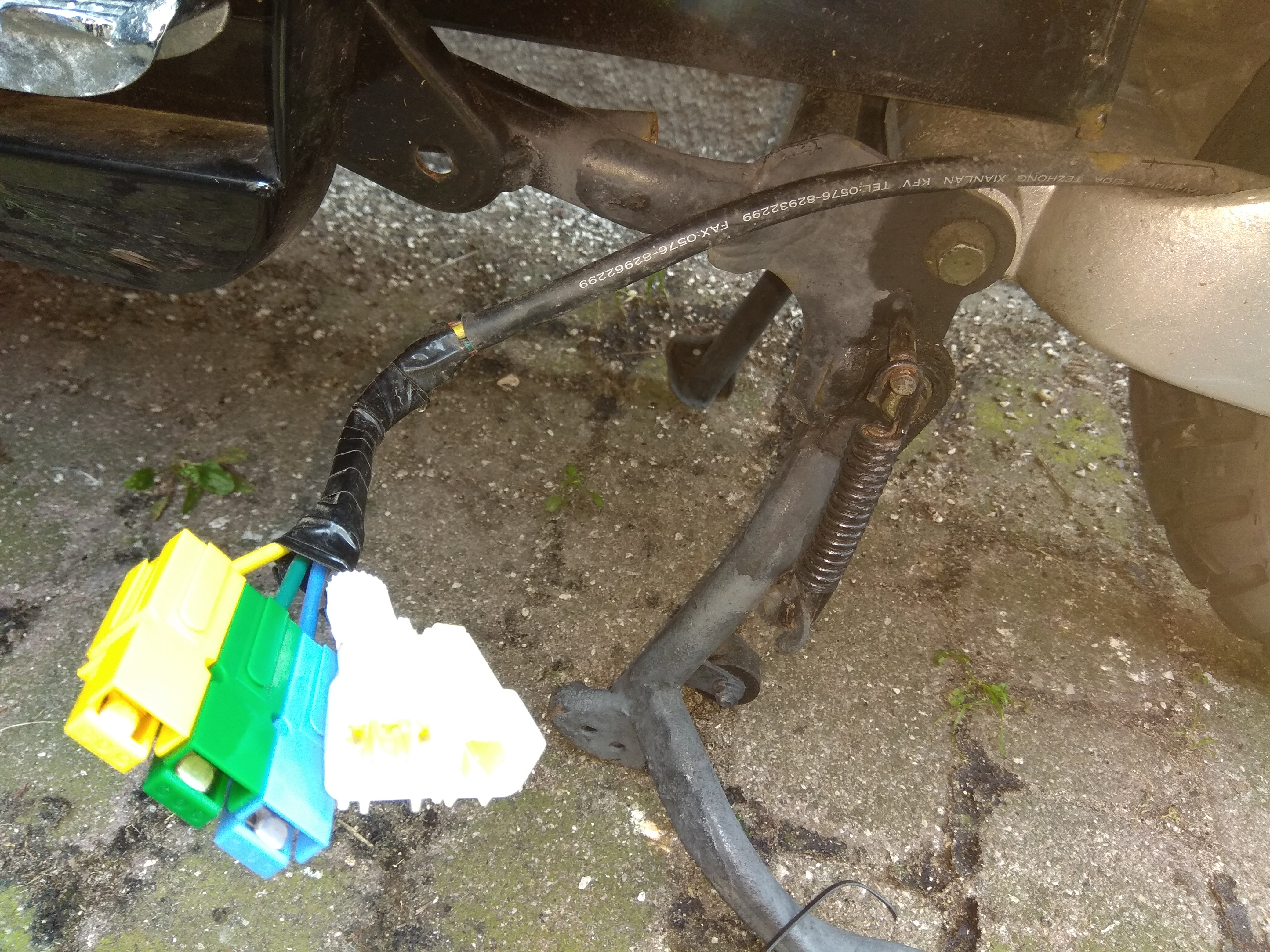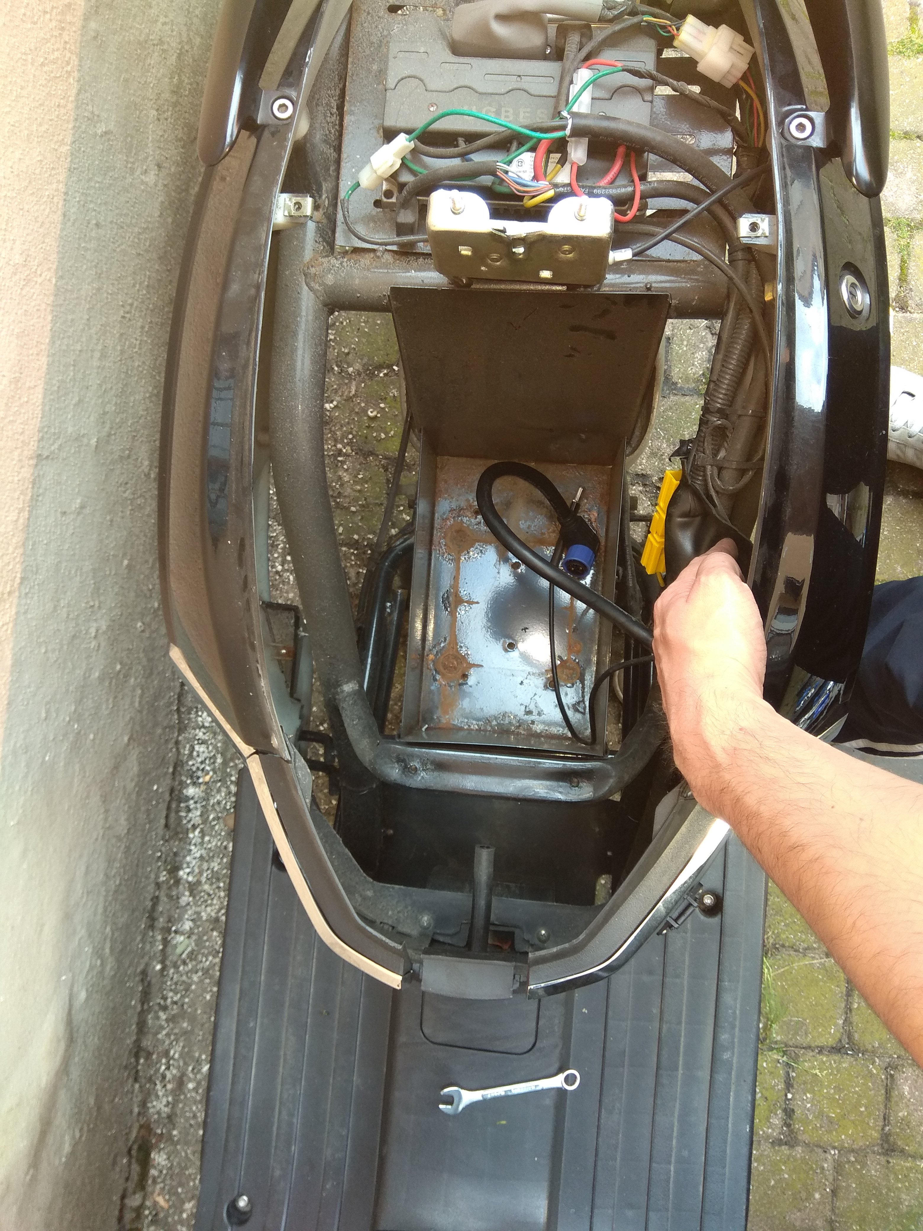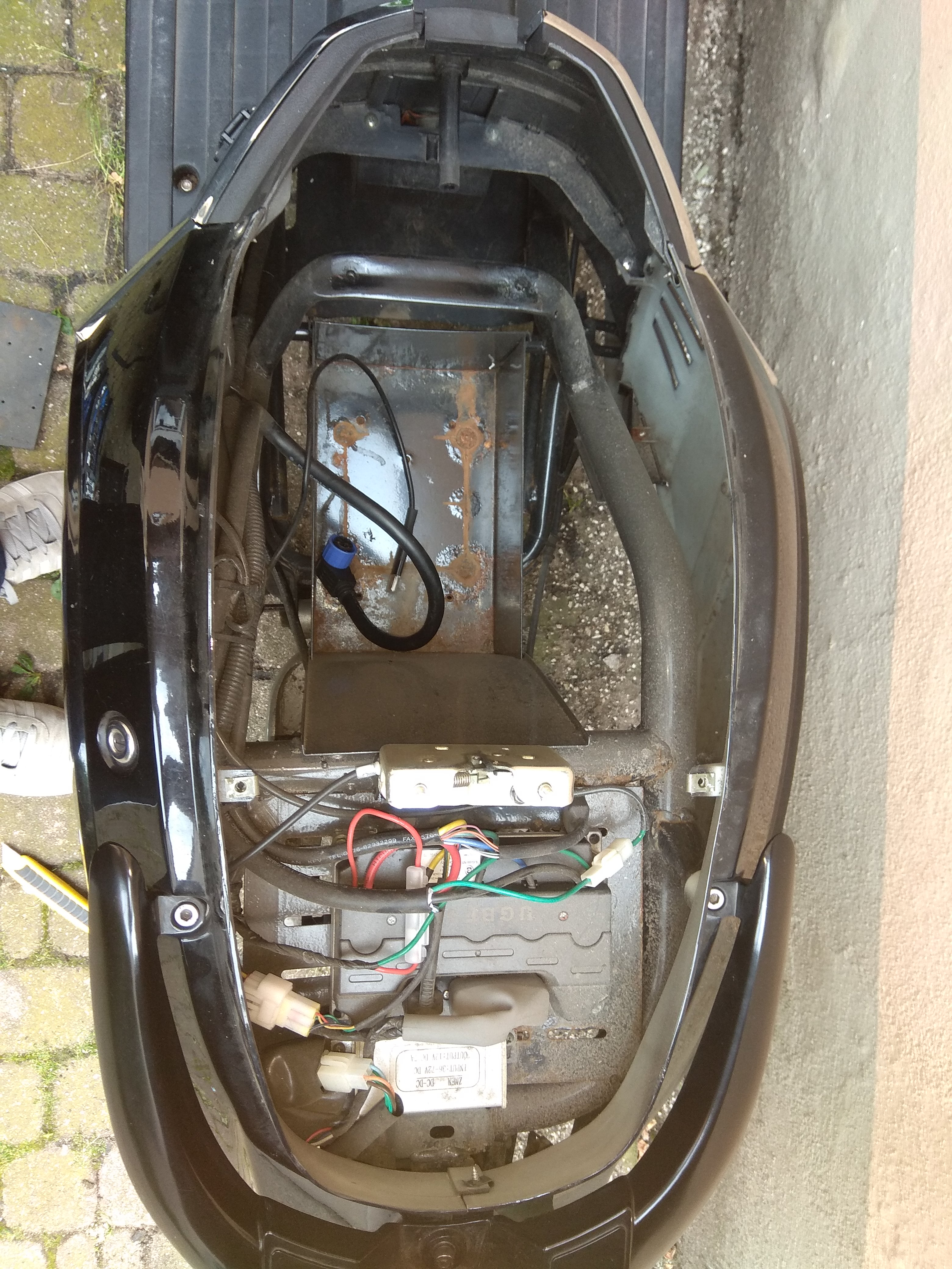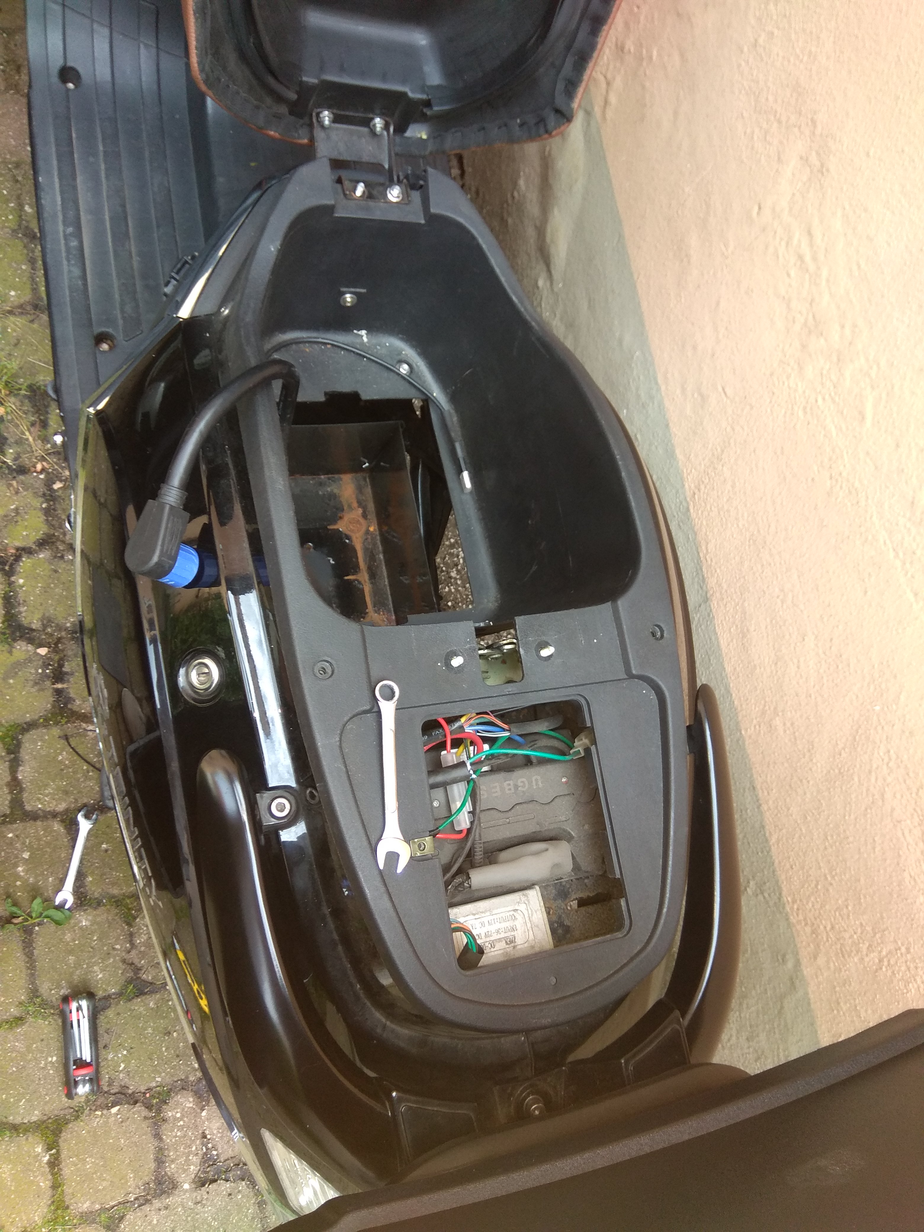 Ich hoffe bloss, das in der Zuleitung zum Hinterrad unter dem großen Schrumpfschlauch hoffentlich eine Phasentrennstelle ist, dann kann ich das Rad nämlich ohne Verkleidungsdemontage vom Roller abmontieren. Das wäre dann ausnahmsweise mal ein Pluspunkt für die chinesischen Designer.