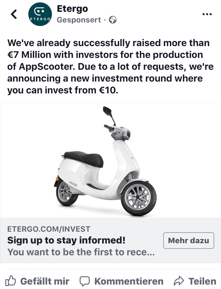 Etergo will weiter Geld einsammeln ... Werbung derzeit auf FB ... also sehr seriös wirkt das ganze nicht ... ich würde dieser Firma keinen Cent vorab überweisen ... bin gespannt ob die irgendwelche 2 kW Roller 2019 liefern werden