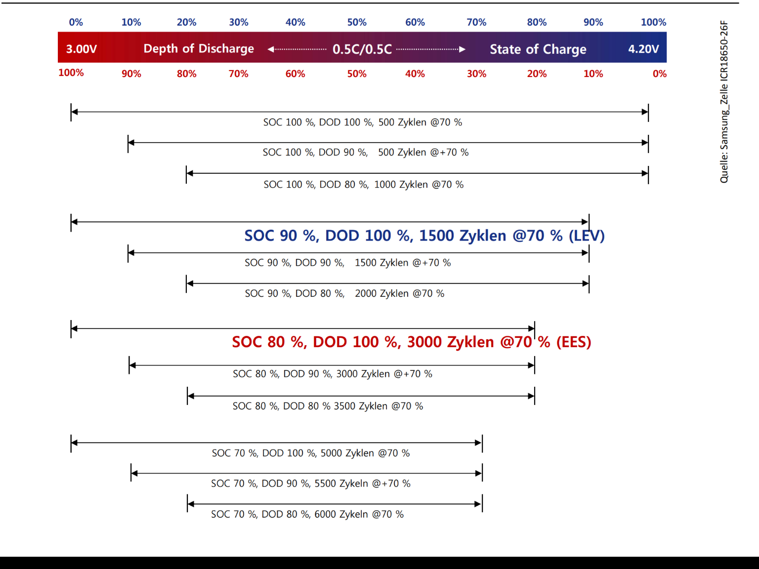 Auch sehr interssant, DOD (depth of discharge oder Entladetiefe) bei 100%, dh. die Zellen wurden auf 3V oder 0% ihrer Kapazität entladen.