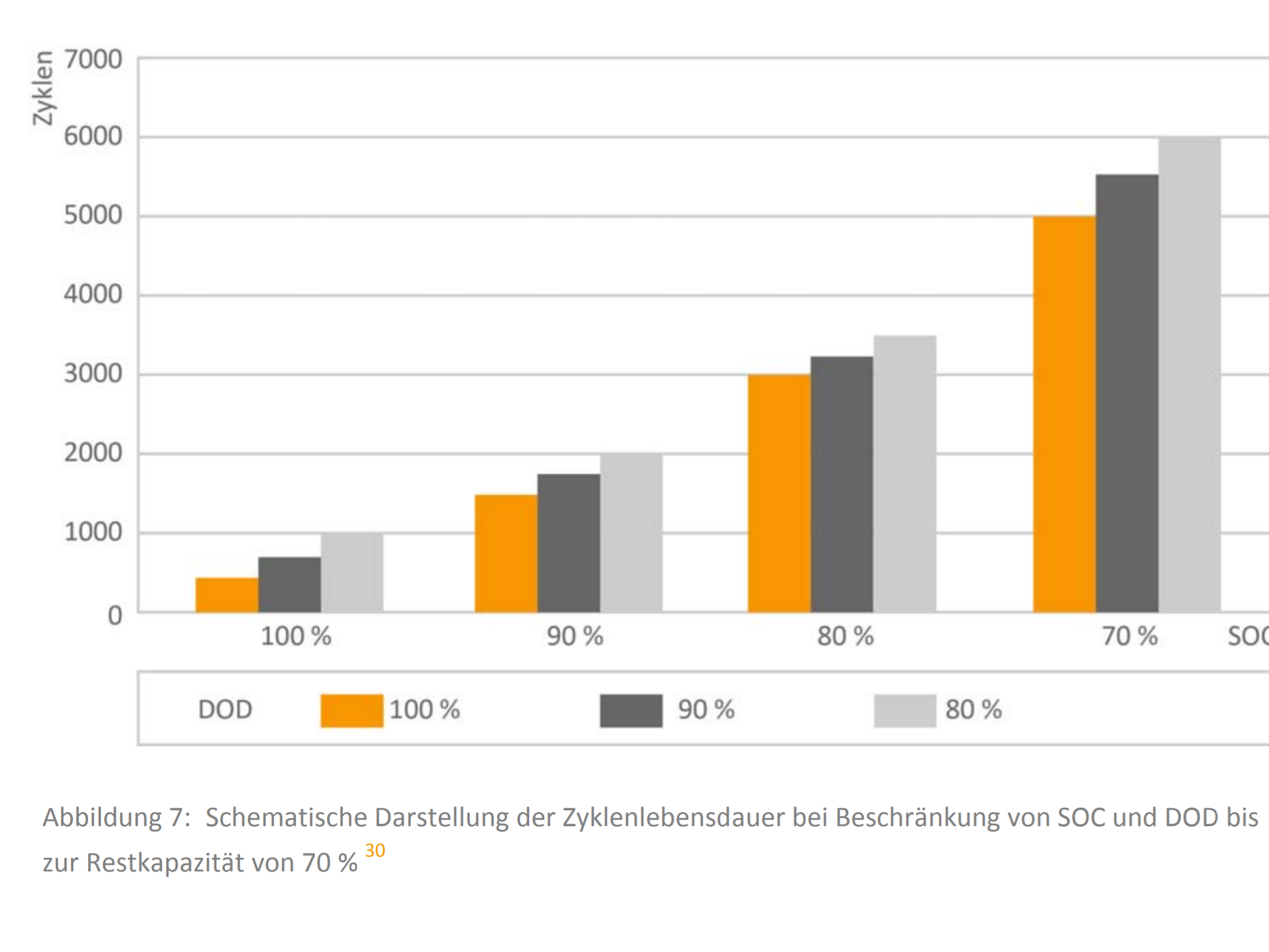 Beispiel: Ausgehend von einem 1,5-kWh-Akku erreicht man bei 90% SOD und SOC nach der Grafik etwa 1750 Teilzyklen, entsprechend 2,1 MWh oder etwa 78.750 km über die Lebensdauer. Beschränkt man sich auf 80% SOD und SOC erreicht man nach der Grafik etwa 3500, also doppelt so viele, Zyklen, dies entspricht aber nicht der doppelt nutzbaren Kapazität über die Lebenszeit, sondern 3,2 MWh oder etwa 120.000 km.