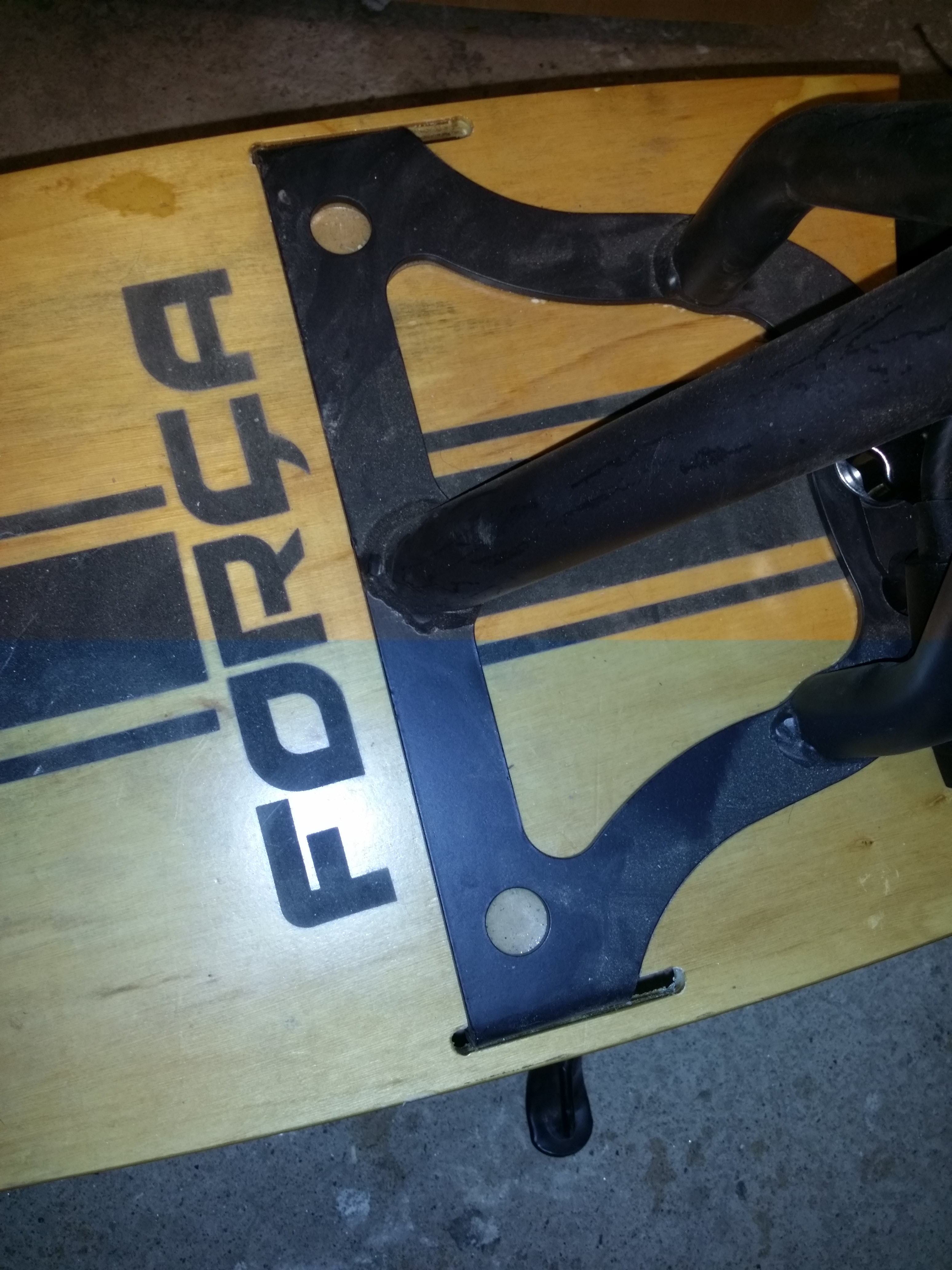 Neben den Löchern im Fuß siehst du docj die Schlitze und dass das Metall des Fußes abgewinkelt ist und durch das Holz durchgreift.