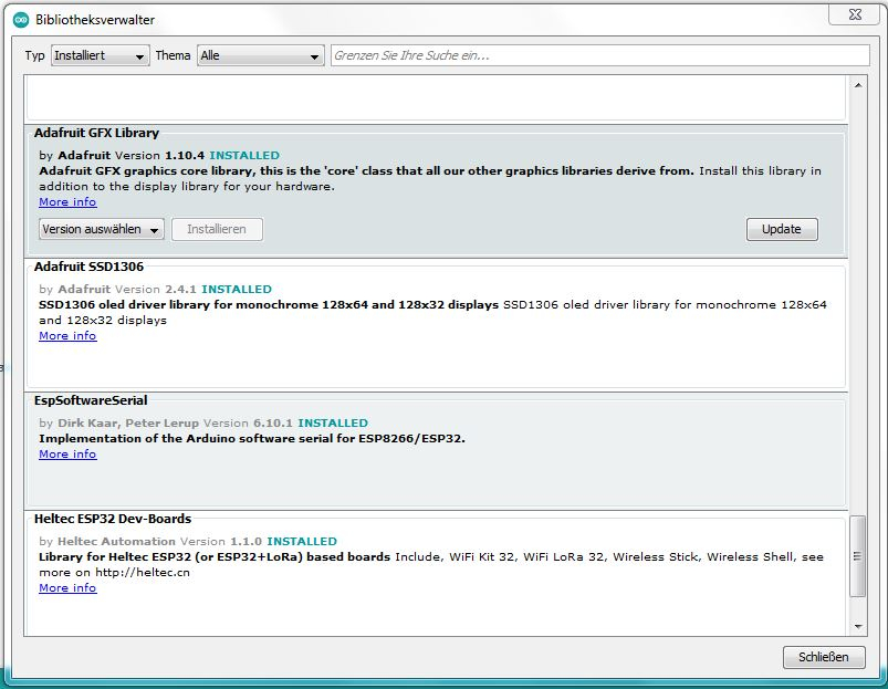 Da scheitert es leider bei mir, ich hab alle Librarys installiert. Aber die Auswahl für Heltec Wifi Kit 32 findet sich bei mir nicht bei Werkzeug/Board.Ruckelg hat geschrieben: Di 9. Mär 2021, 21:00