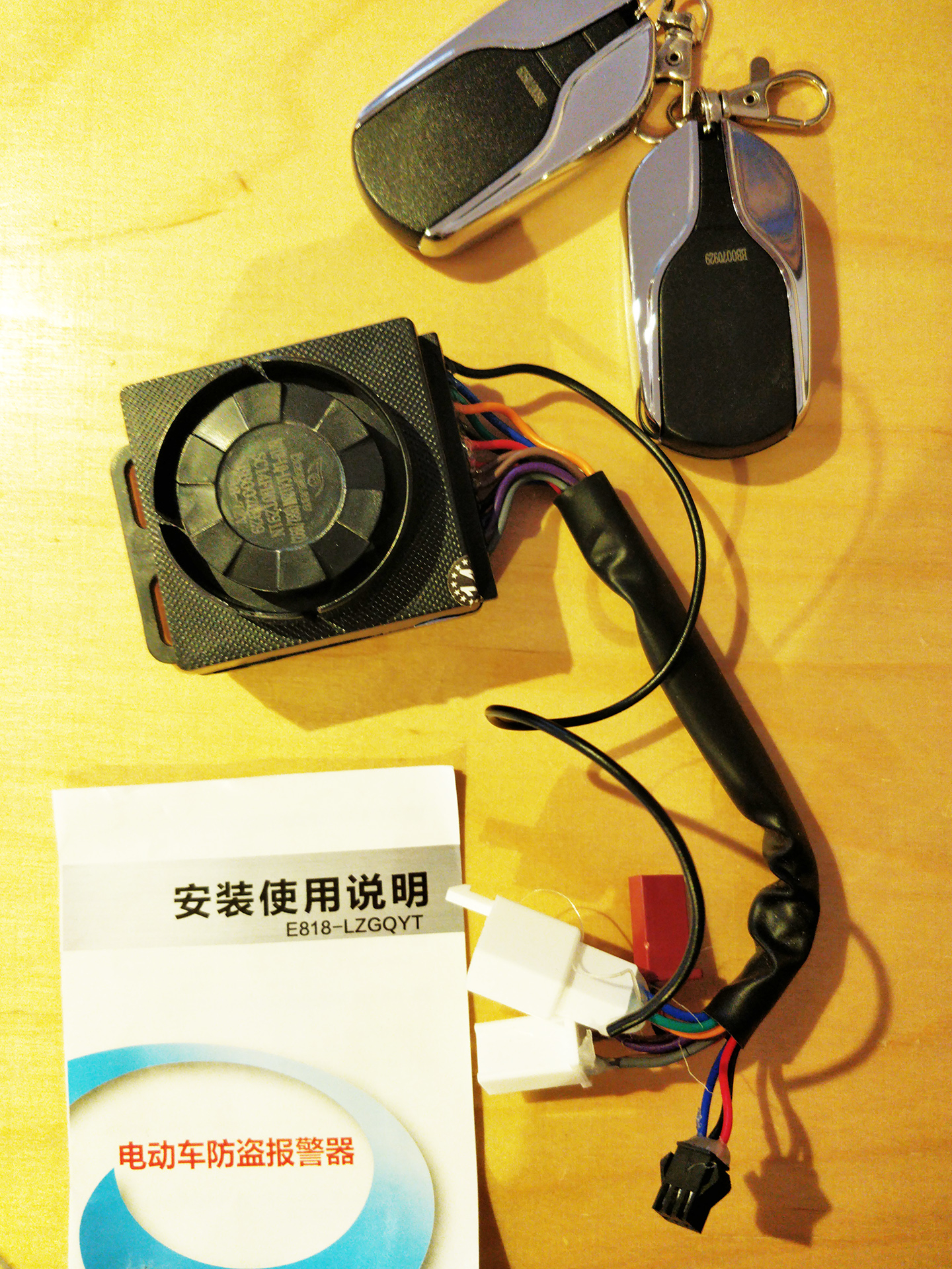 Die Alarmanlage bzw. sehr ähnliche Komponenten findet man übrigens bei Banggood bereits um wenig Geld sieht ca. so aus: https://www.banggood.com/sv/48V-72V-125 ... rehouse=CN - aber es wird eine Variante mit 4 Steckern und nicht mit einem benötigt. Siehe Bild:
