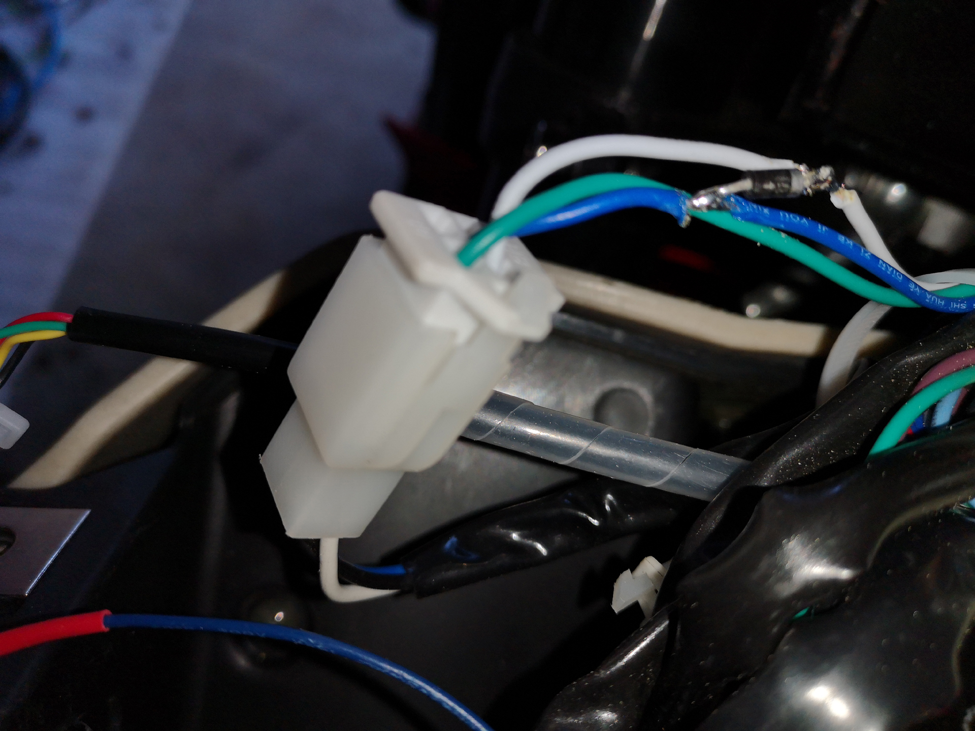 1. Um beim Fernlicht auch weiterhin das Abblendlicht eingeschaltet zu lassen*, kann man eine Diode (1N4007 oder ähnlich) am Stecker für die Scheinwerfer (unter der Cockpit-Kanzel) anlöten. Die Anode kommt da an das blaue Kabel, die Kathode an die weiße Leitung. Nicht vergessen das Ganze dann wieder mit Isolierband abzukleben.