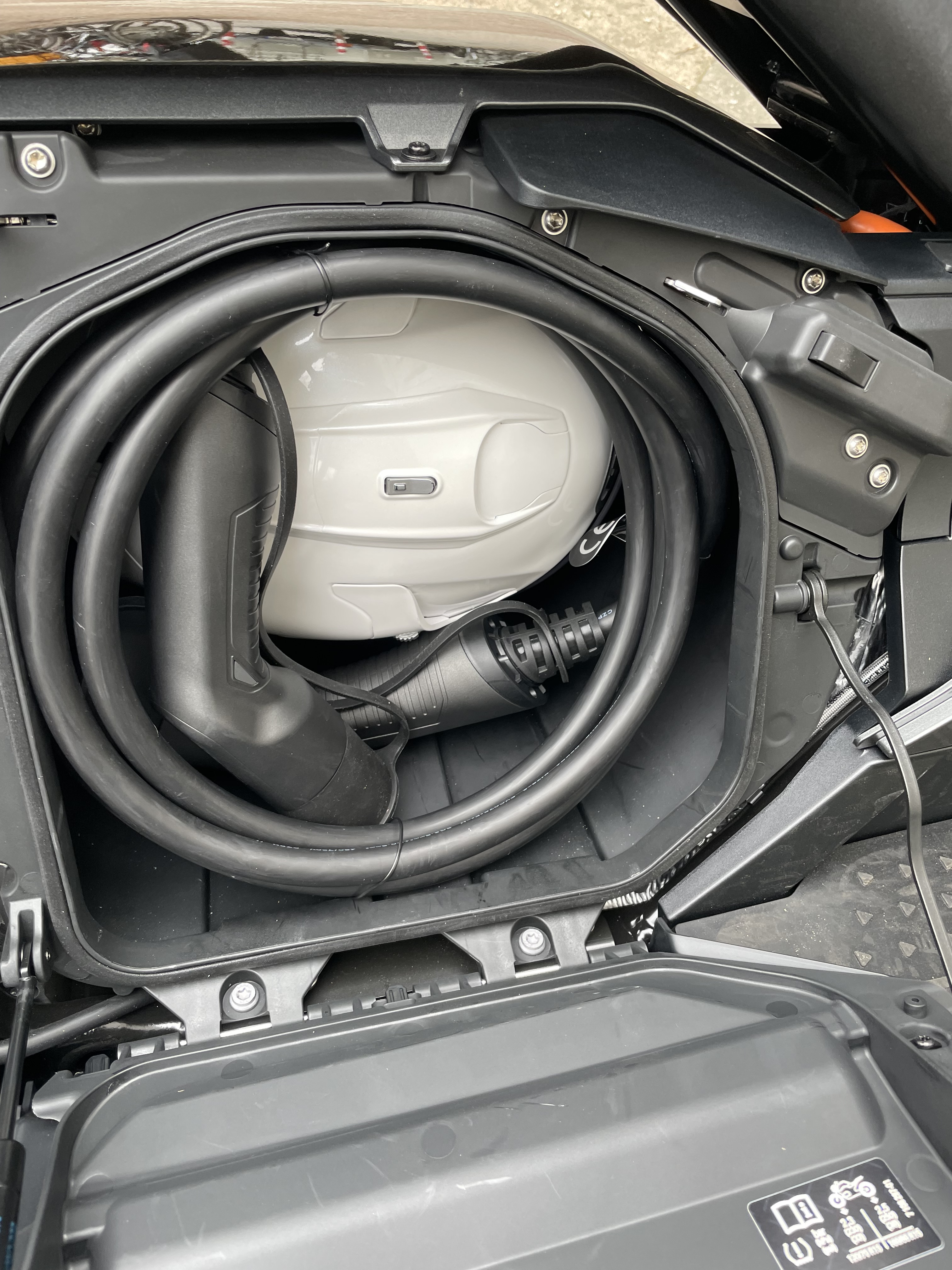 Ich habe noch ein Bild gemacht um zu sehen, ob das 3 Meter Kabel, dass ich mir auf Empfehlung weiter oben gekauft habe zusammen mit meinem Helm ins Seitenfach passt. Ja es geht, aber es ist schon verdammt eng.