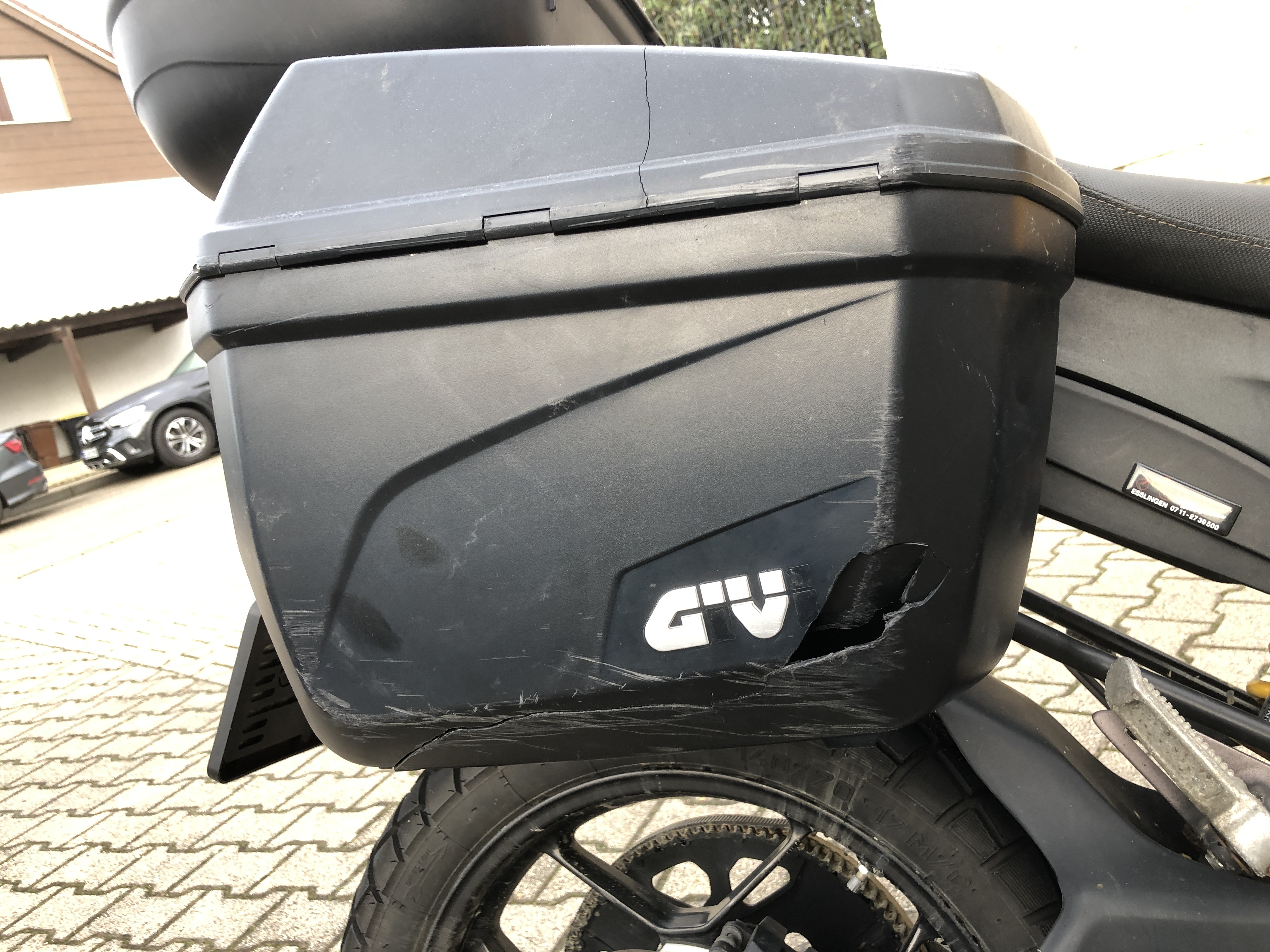 Dann im Detail von hinten nach vorn: Der zersplitterte Seitenkoffer rechts: .