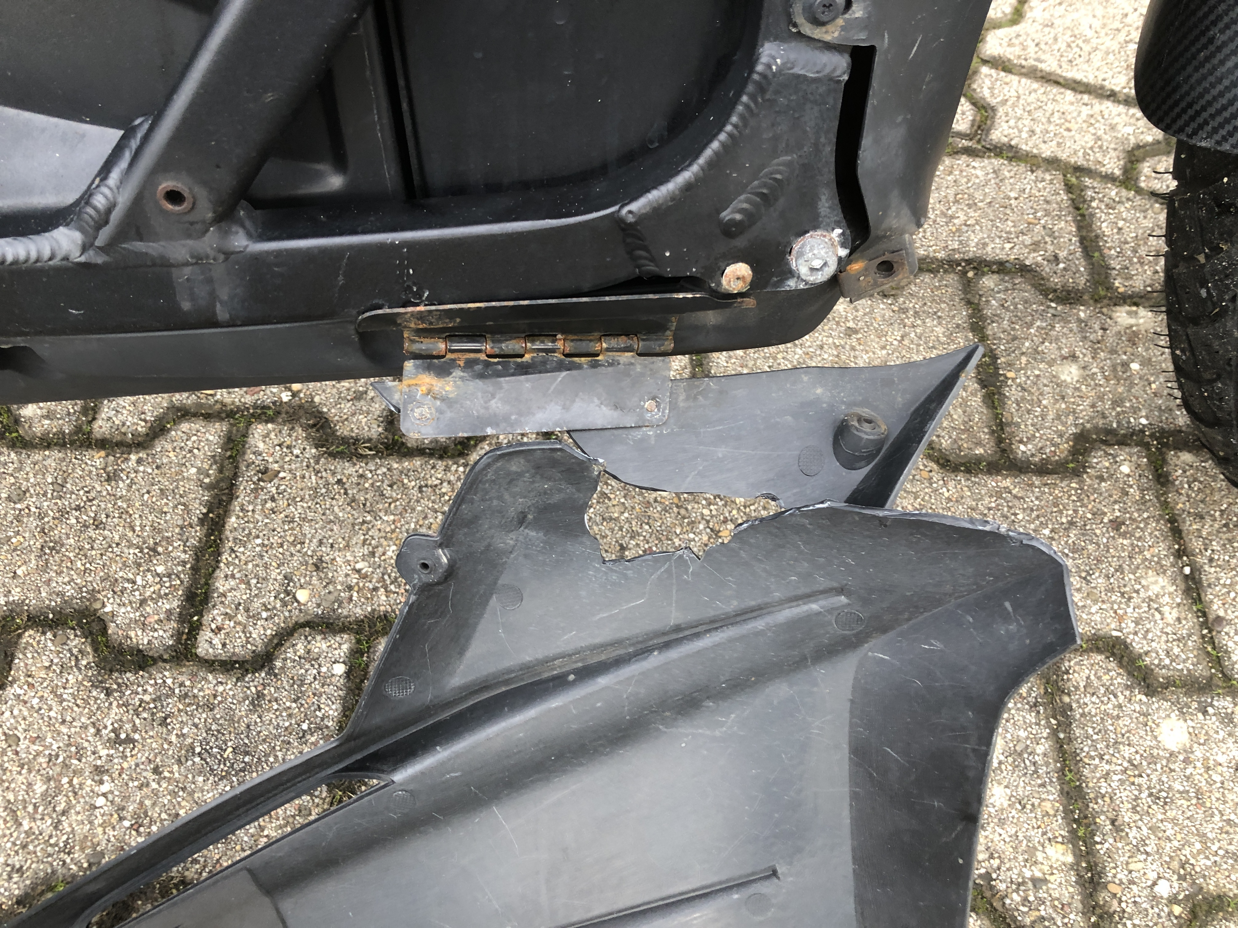 Die abgerissene Seitenverkleidungsklappe rechts: .