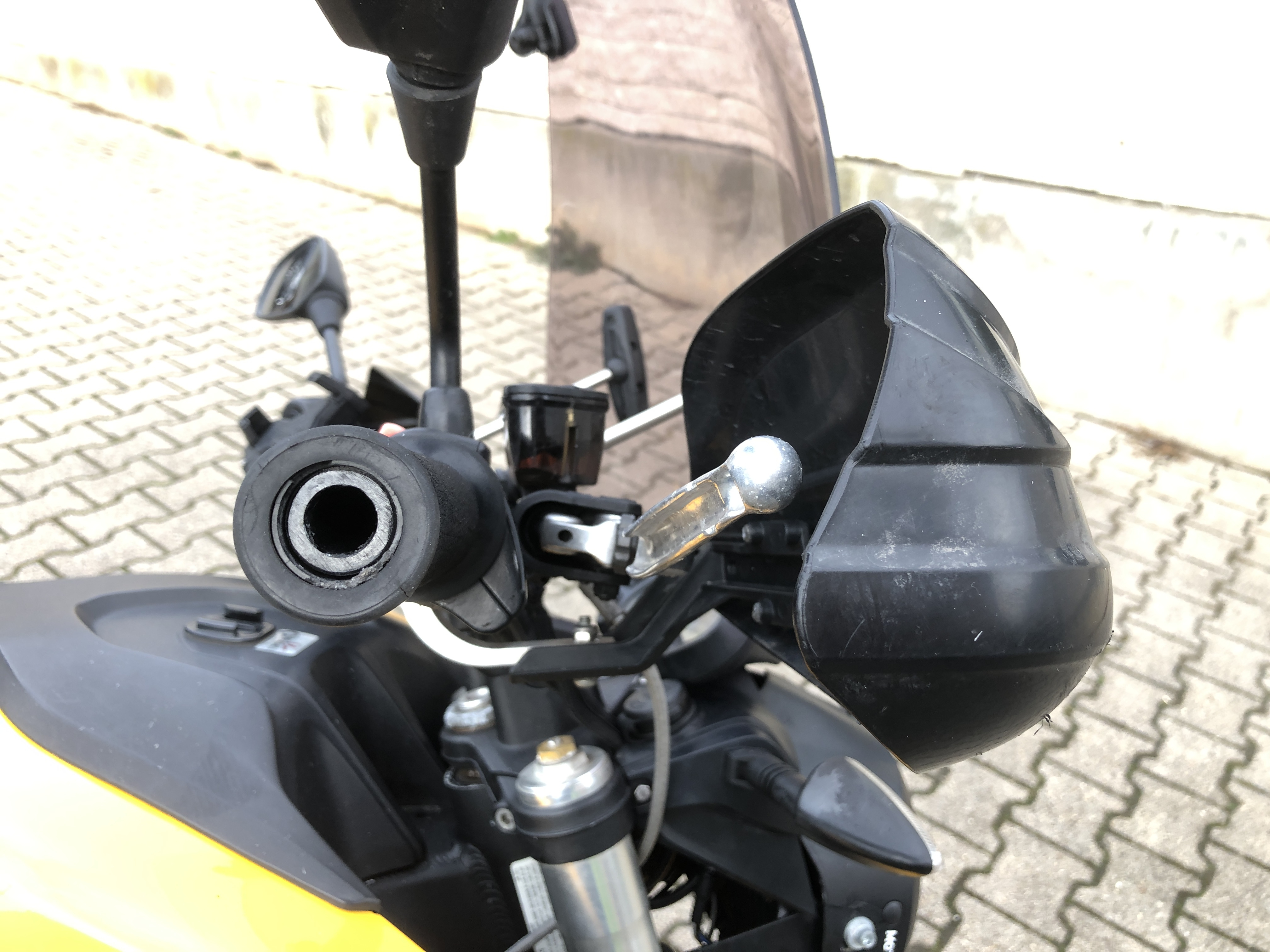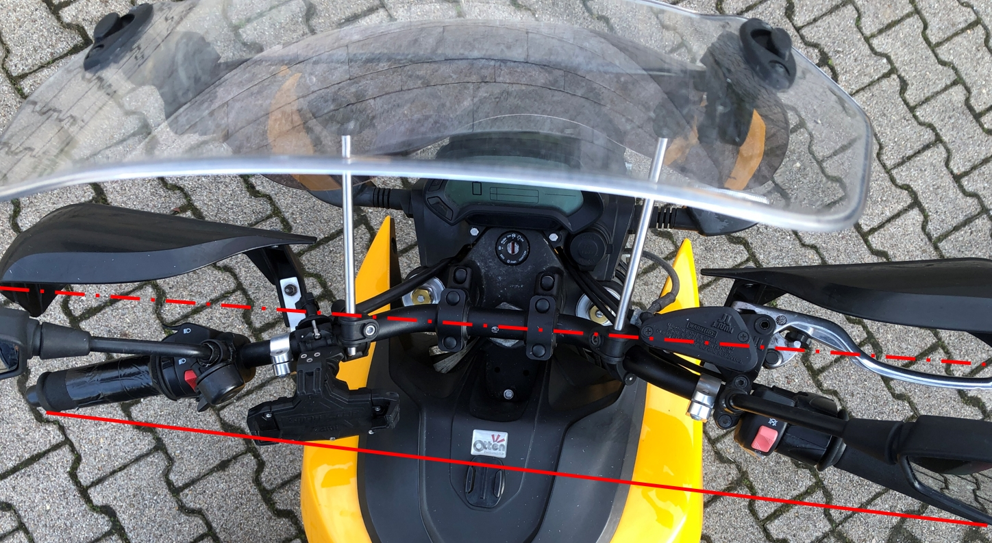 Hab dann gleich eine fette Runde in Garagingen eingelegt, und jetzt sind die Bremshebel und Lenker neu, und alles am neuen (unverbogenen) Lenker wieder richtig angebaut und ausgerichtet. Auch die neuen Griffschalen der DS sind montiert. Endlich wieder ein sicheres E-Mopped