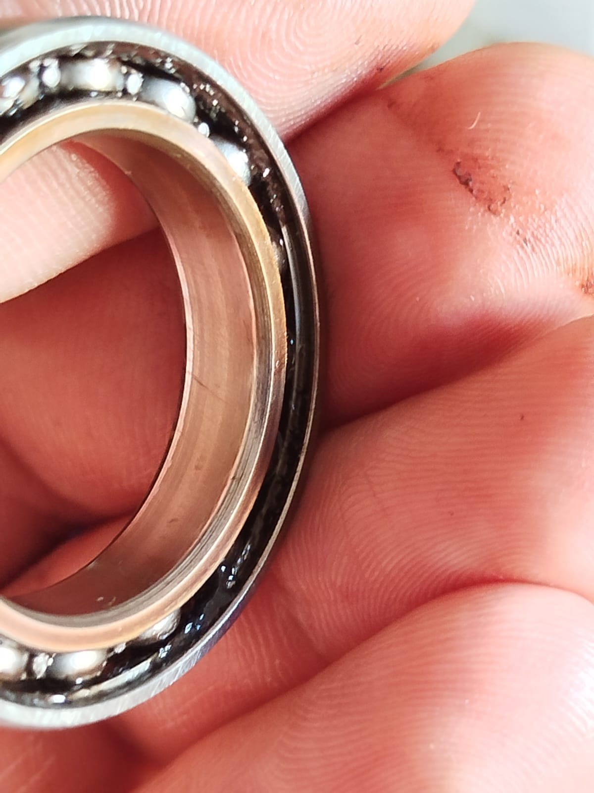 Ein Lager der Antriebsseite hackt (ich hatte beide Lager der Antriebsseite erneuert), und ist sogar am Innenring angelaufen. Das bedeutet es hat sich der Innenring auf der Welle gedreht und nicht das Lager selbst. Man kann auch Schleifspuren am Außenring erkennen. Also ist der Lagersitz im Gehäuse auch defekt.