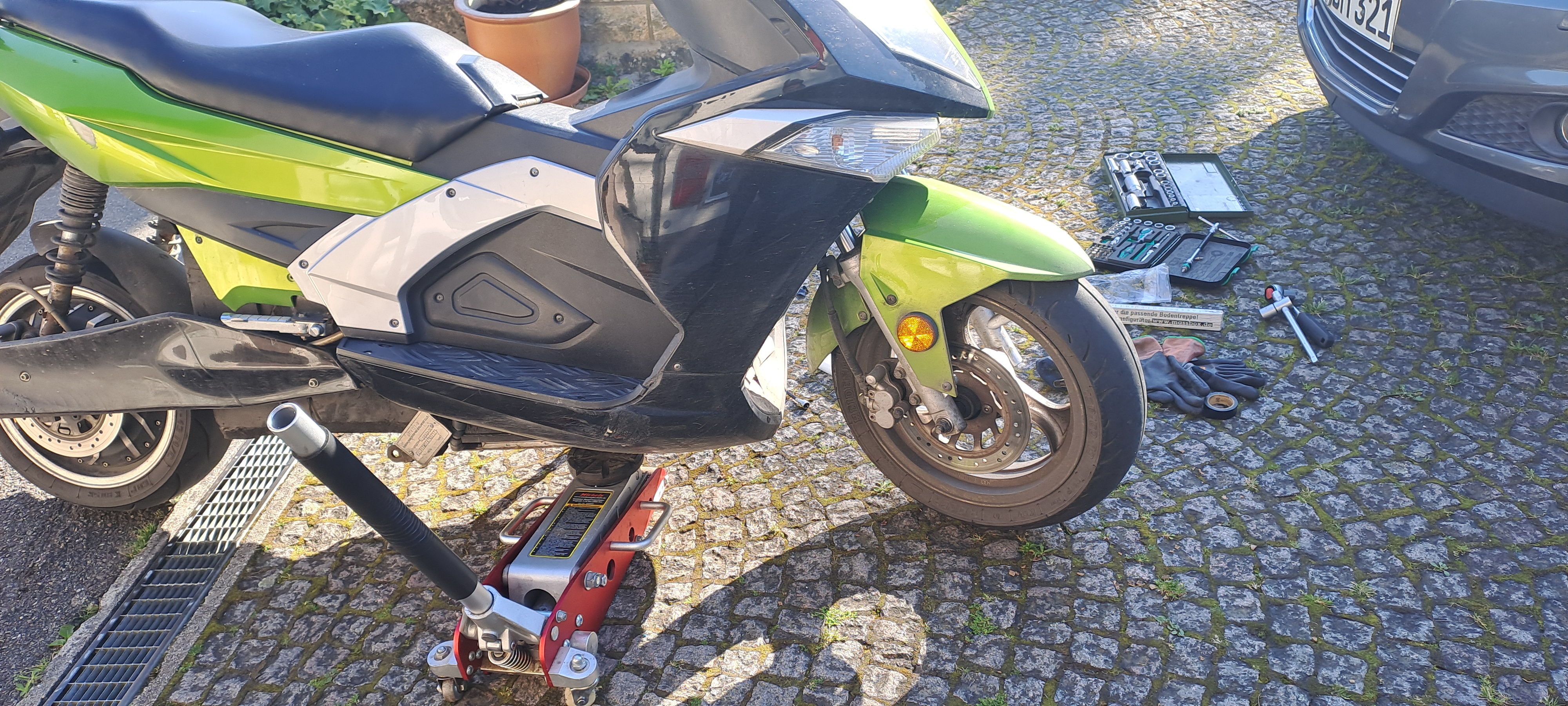 Einziges Manko, die Schraube zum Tachoantrieb ließ sich auch mit dem Schlagschrauber nicht öffnen, so musste ich kurz das Vorderrad lösen und den Antrieb wechseln. Da ich ja keinen Hauptständer mehr verbaut habe, muss ich unterhalb des Akkus an meinem Halteblech mit den Meanwell-Ladern mit dem Wagenheber ansetzen um das Vorderrad zu entlasten.