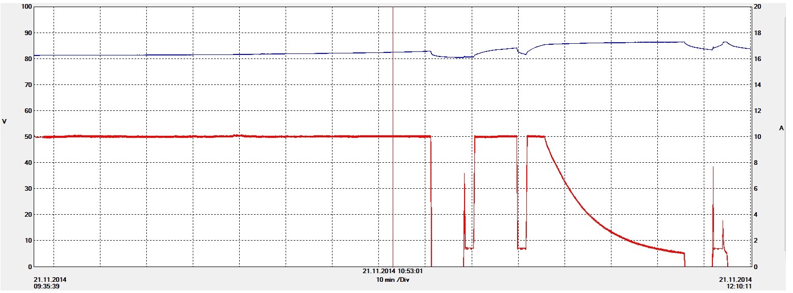 Und dann probiere ich auch mal das Garagen-Thunder Ladegerät aus, vielleicht vielleicht ist es noch die alte Variante, die bis 87V geladen hat und am Schluss noch eine richtige Konstantspannungsphase hatte...