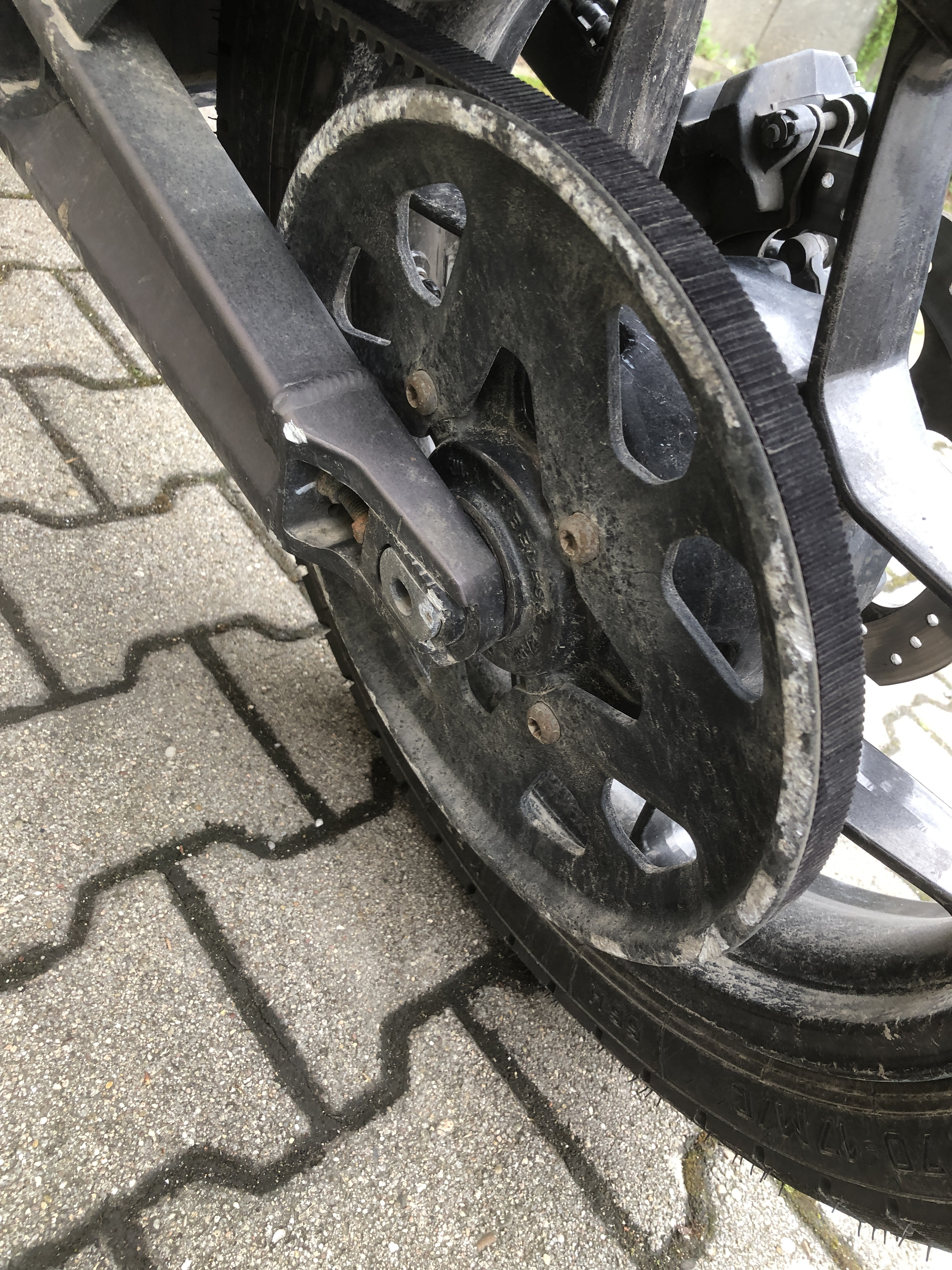 Die Sozius-Fußraste links ist abgebrochen, da habe ich kein Bild von gemacht. Hier mal das rundum zerkratzte Riemenrad hinten, weil das Hinterrad sich noch recht schnell gedreht hat während der Rutschpartie. Ist aber rein oberflächlich, der Riemen läuft weitererhin sauber