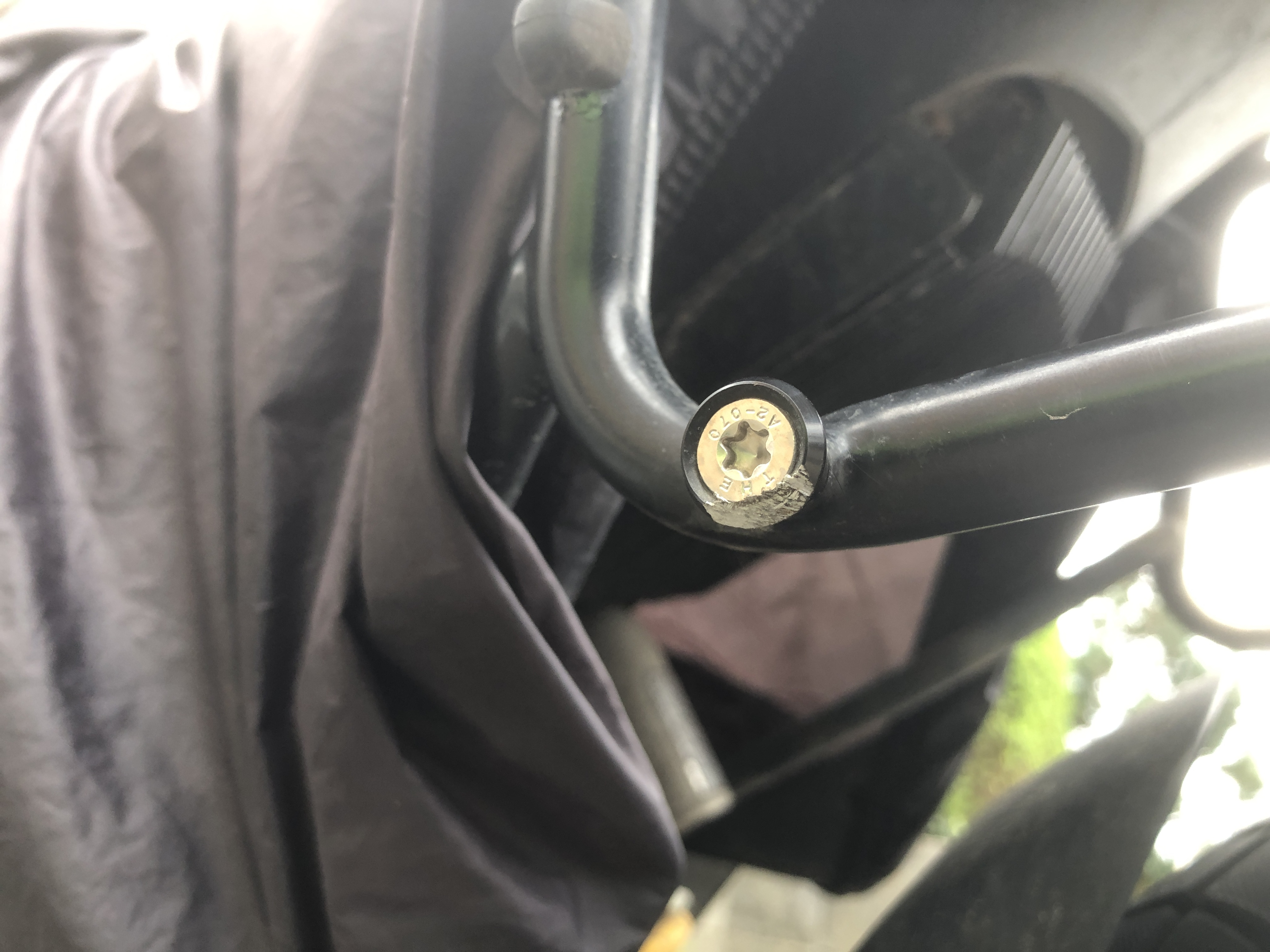 Am schlimmsten hat es den linken Seitenkofferhalter erwischt, der zum Glück ohne Seitenkoffer war. Er wurde komplett nach oben gebogen, hat unter der Sitzbank die Schraube abgerissen und sich dort rein gebohrt. Hier wieder grob nach unten gebogen. Auch der linke Blinker ist hinten ab: .