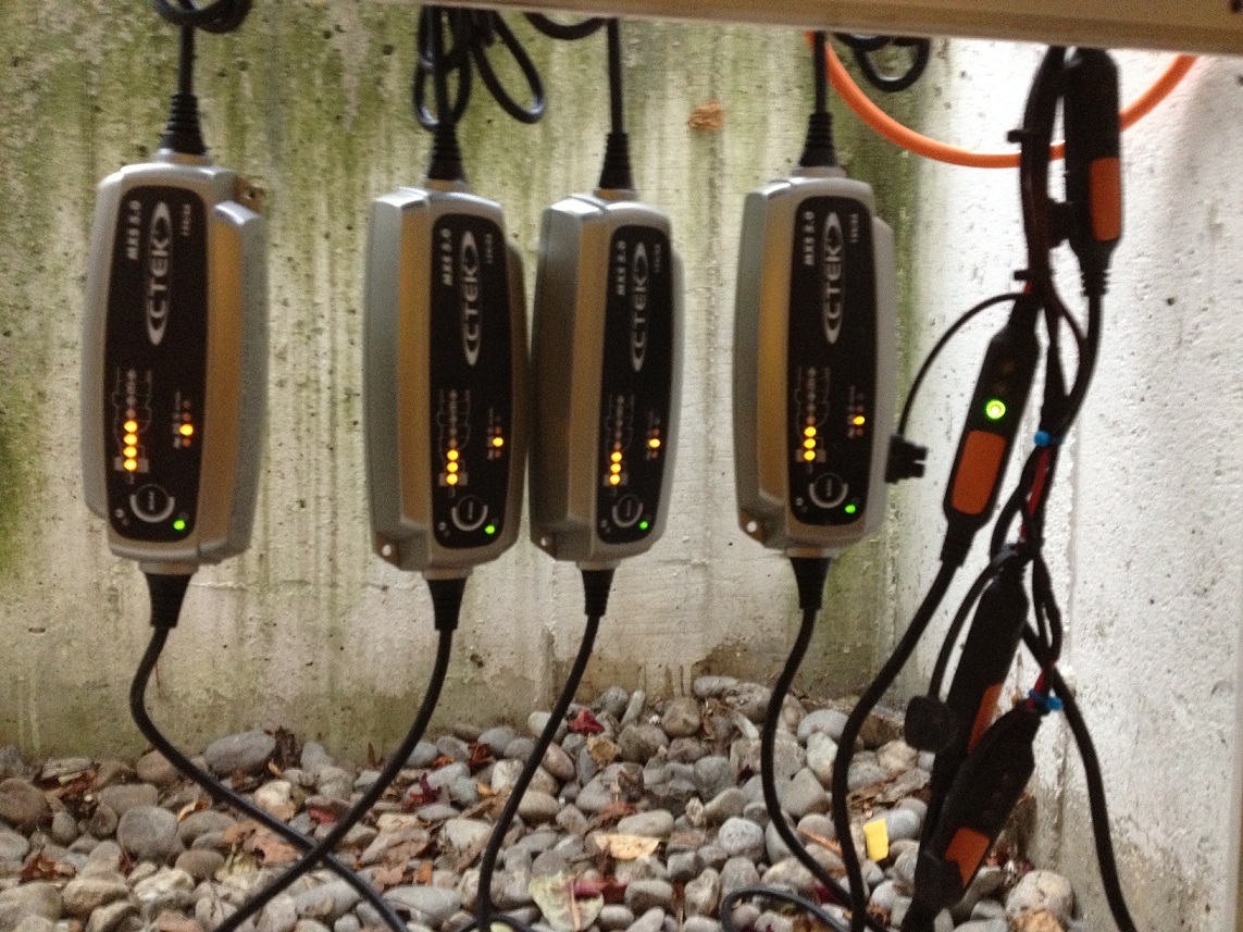Trotzdem würde ich noch zusehen, dass die Ladegeräte vor Regenwasser geschützt sind, das evtl. durch das Gitter eindringen kann.