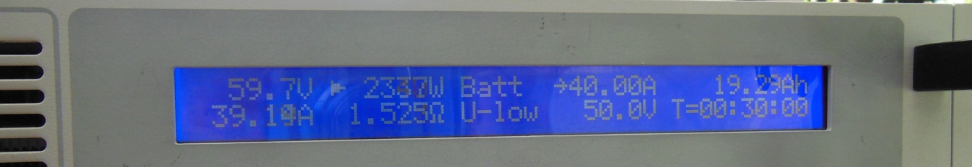 Nach 29,59Ah war Schluss mit 40A Last, und im Schnitt 2,5V pro Zelle als Entladeende-Vorgabe.