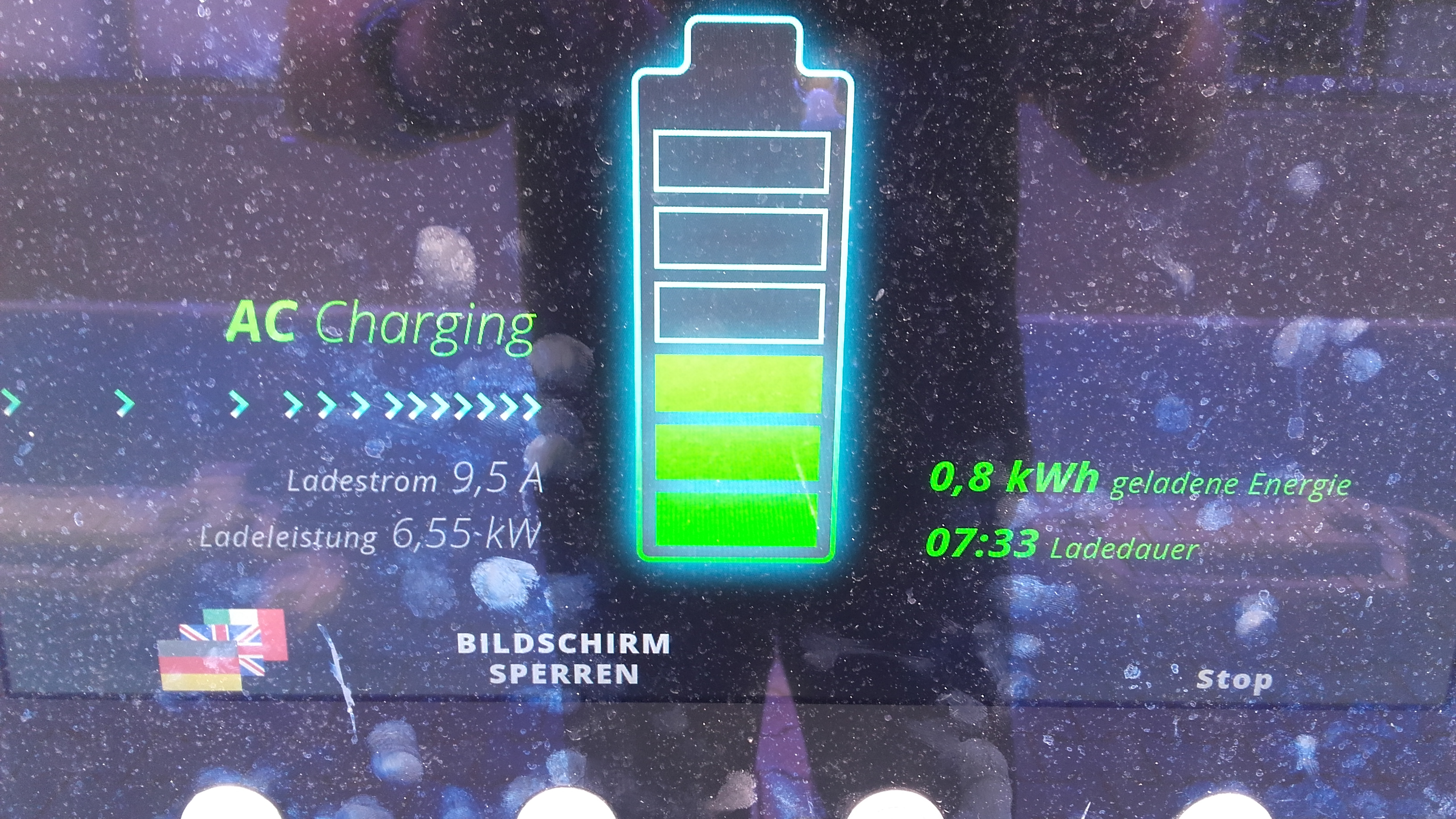 Angezeigter Ladestrom 9,5 A.(TFT des CE04 zeigt bei diesem Ladestrom 3x10 A)