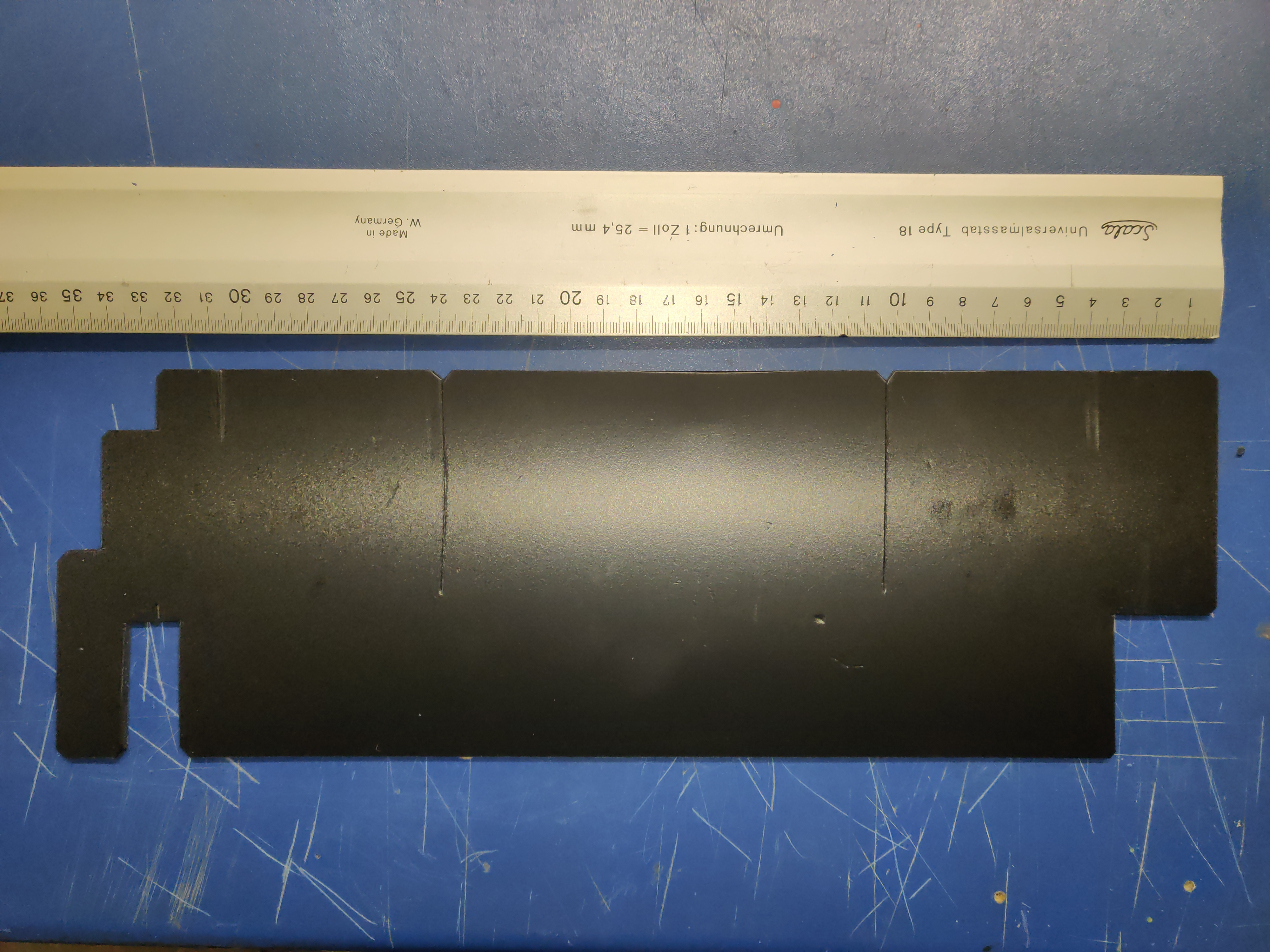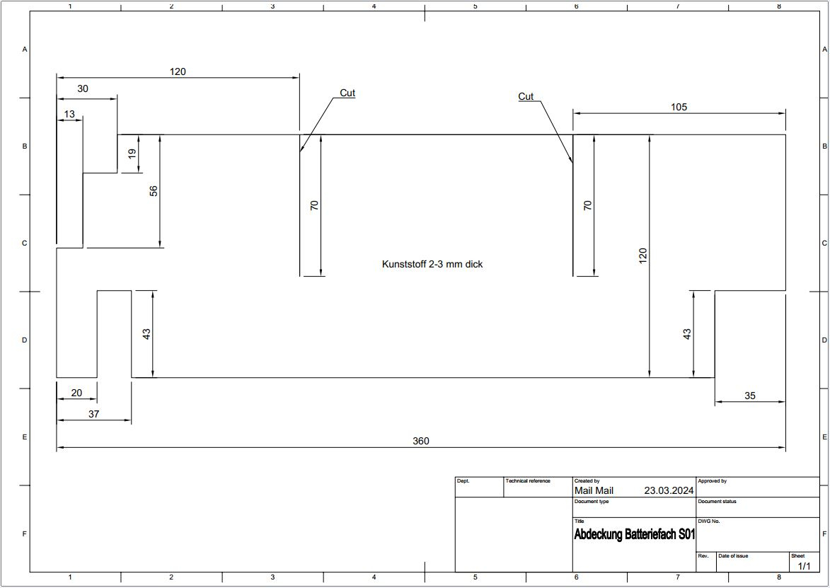 Das Ganze besteht aus einer Kunstoffplatte 3mm dick (bin im Baumarkt fündig geworden), lies sich problemlos mit dem Cuttermesser schneiden. Habe auch eine kleine Zeichnung gemacht damit sich das jeder selbst nachbauen kann. Zum Einbau muss man nur die beiden Schrauben (TX25 mit Stift) der rechten Batteriebachabdeckung lösen und die Abdeckung etwas aufdrücken.
