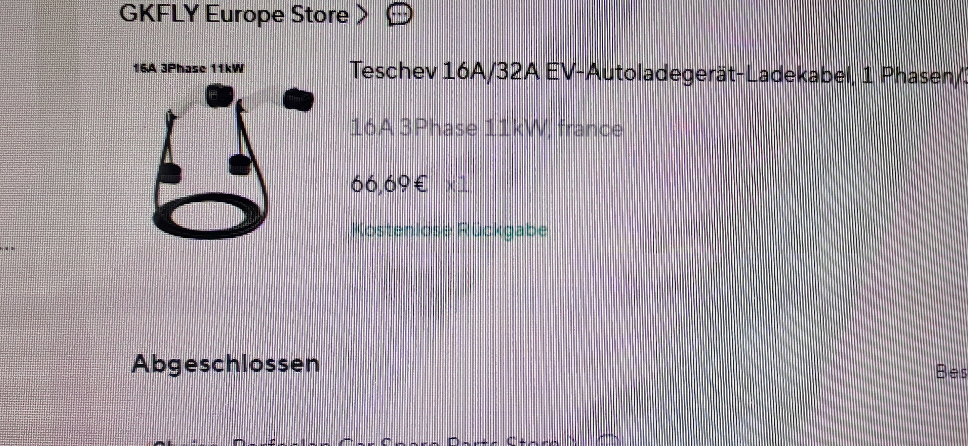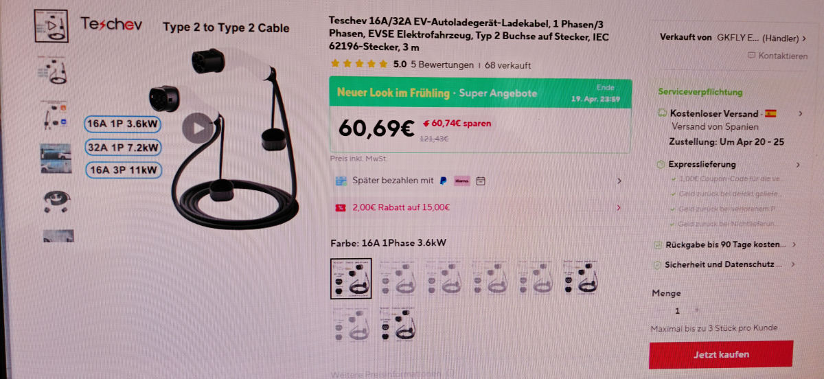 Ich bin seit gestern wieder einen Schritt weiter: das Ali Express Typ2 Kabel scheint überall zu laden, die Ladegeschwindigkeit beginnt mit 1,1 kw/h, sehr gut.
