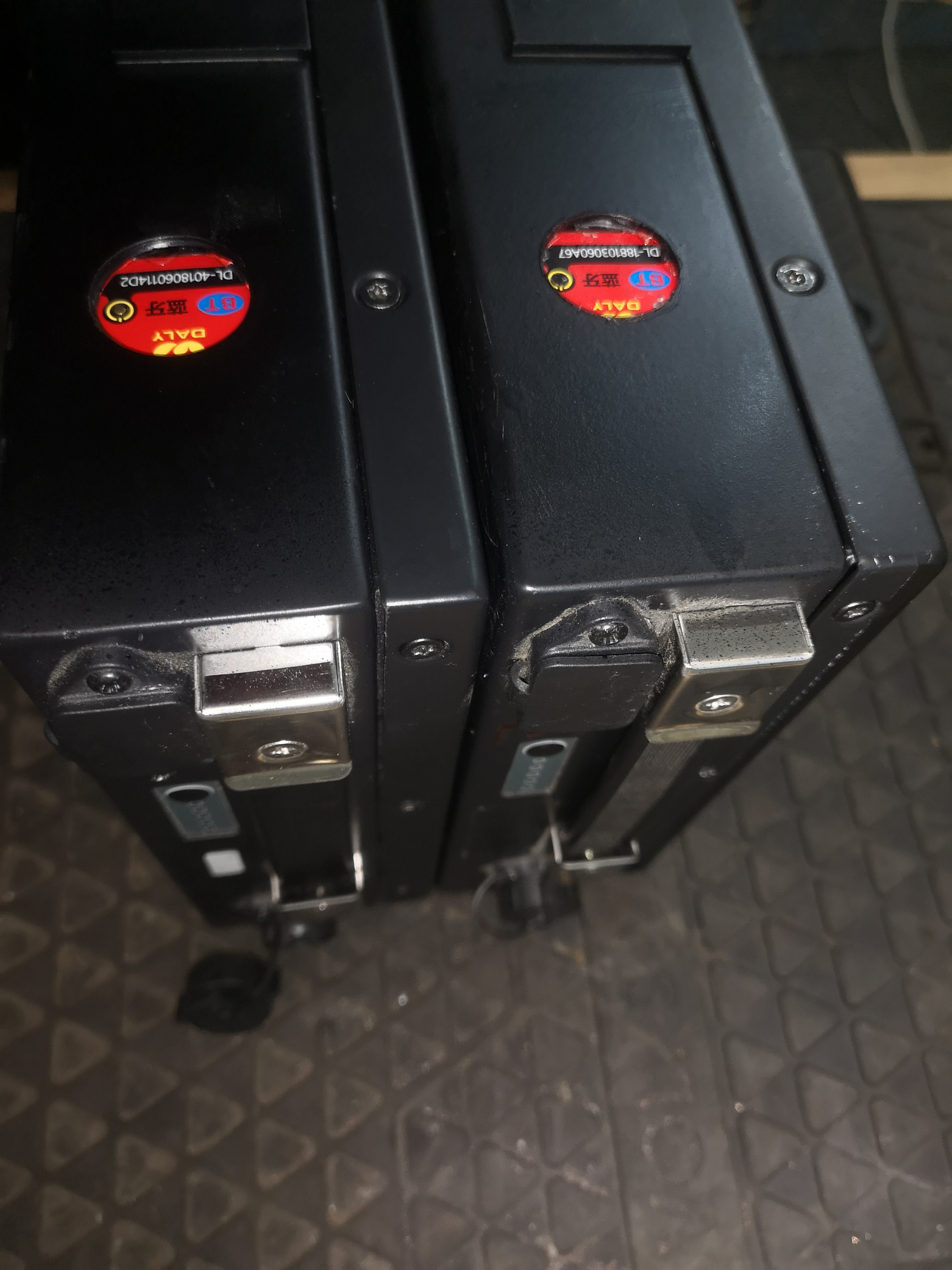 Allerdings war eine der beiden Batterien „eingefroren“. Sie ließ sich weder laden noch entladen. Daher habe ich sie aufgemacht und das BMS vom Akkustrom B+ und B- getrennt. Danach funktionierte er wieder. Dabei habe ich festgestellt, dass das BMS mit 20A nominaler Leistung angegeben war – eine kleine Platine, die nur durch eine dünne Isolation auf den Zellen klebt und bei Überhitzung durchaus Schaden anrichten kann. Nach einigem hin und her kam die Auskunft vom Hersteller, dass sie angeblich gar kein größeres BMS liefern können. Dabei war in der Tabelle ganz klar 50A angegeben. Das grenzt an gefährlichen Betrug. Ich bekam 50$ /Akku zurück und habe dafür Batteriemanagementsysteme 60A mit Bluetooth von Daly eingebaut. Sie passen oben quer grade so ins Gehäuse, weil die Anschlusskabel recht flexibel sind.