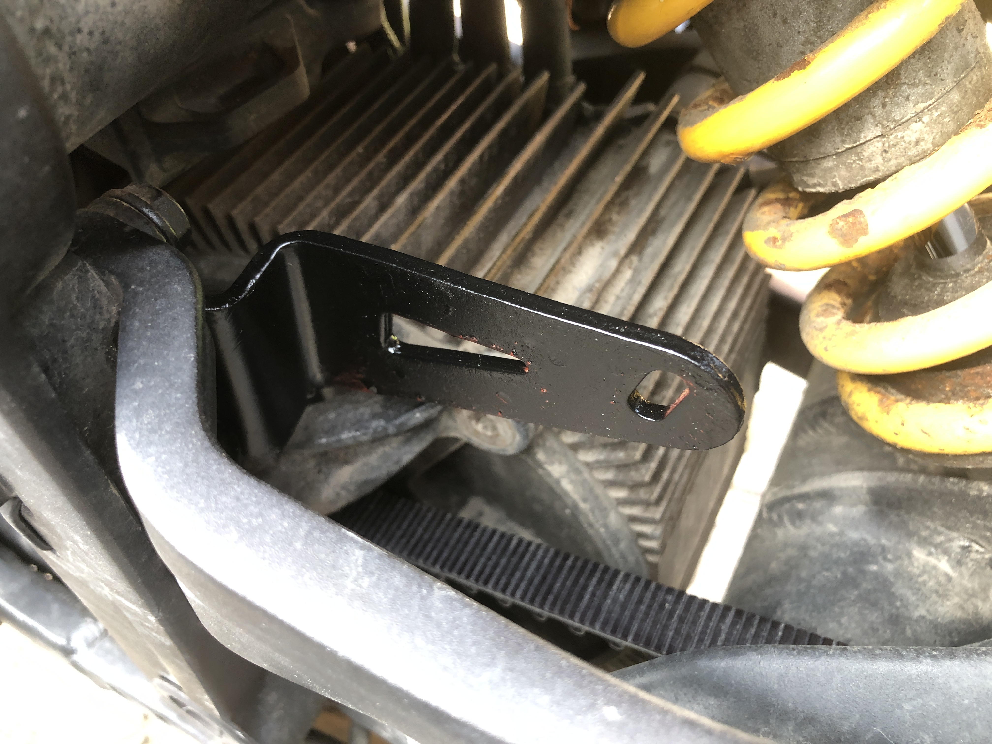 In der Mitte, über dem Motor, war der untere Befestigungswinkel für den Seitenkofferrahmen etwas verbogen worden, und die Pulverbeschichtung war abgeplatzt vom darunterliegenden Rost. Nachdem er wieder zurechtgebogen war musste erst mal der Rost so gut es geht runter, was aufgrund der Enge, und Riemen und Motor mit Zeitungen abgedeckt, mit einer schmalen Stahlbürste in der Borhmaschine gerade so ging. Eine Lage braune Grundierung und drei Schichten schwarz später sieht das jetzt wieder ordentlich aus: .