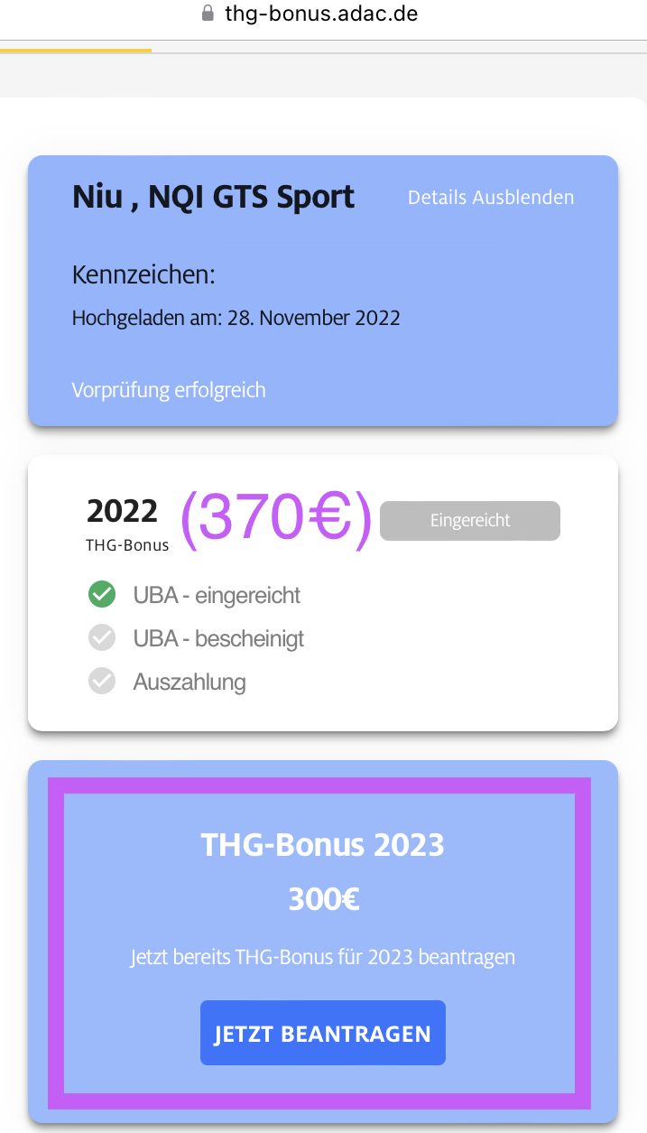 Also ich war mit Geld für eAuto super zufrieden. Die garantieren 400 Euro für 2022 und ging recht schnell (ziemlich genau 3 Monate bis Auszahlung, was bei der aktuellen Bearbeitungszeit vom UBA top ist). Solange du vor dem 31.12. die Papiere hochlädst, sollte das auch kein Problem sein. Nur haben die eine Klausel drin, dass man auch für 2023 bei denen bleiben muss, wenn man nicht widerspricht (das ging aber per Mail super einfach, muss man nur wissen).greifswald hat geschrieben: Di 20. Dez 2022, 15:56 Nachdem Instadrive wohl etwas heikel war und ich überraschenderweise heute die Papiere zu meiner 125er bekommen habe: Welcher Anbieter ist zu empfehlen, insbesondere welcher meldet noch rechtzeitig die Quote für dieses Jahr an?