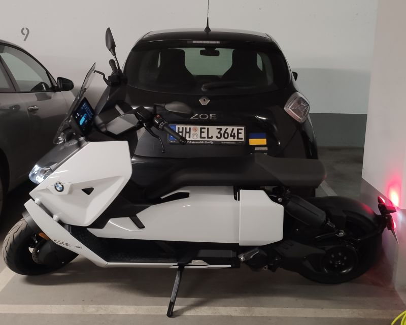 So sieht das dann quer hinter dem Auto aus, der Zoe steht vorne ganz an der Wand und zwischen Roller und Auto passt so gerade eben noch ein schlankes Bein: Also das Fahrgefühl ist schonmal traumhaft, kein Vergleich, nichtmal ansatzweise, mit irgendeinem anderen 125er, egal was. Das ist wie ein Vergleich eines Zoe mit einem Tesla für 100k. Der Silence kostet die Hälfte vom BMW aber ich würde sagen, man bekommt beim BMW mehr als das Doppelte für sein Geld.
