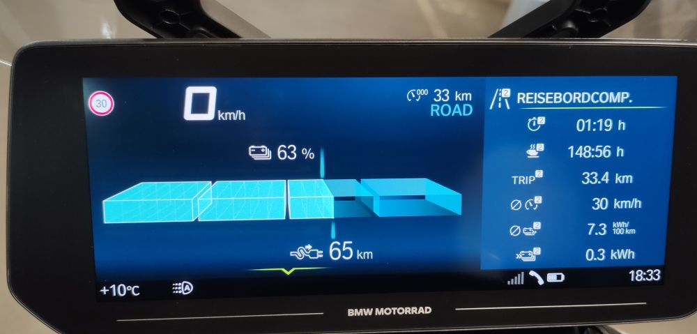 98km Reichweite insgesamt sagt er mir vorraus. Das passt auch mit dem km und dem Batteriestand etwa. Das ändert sich nur unwesentlich mit dem eingestellten Fahrmodus. Das bei angezeigten 7,3 kWh/100km. Letzteres halte ich für glaubhaft, denn ich hatte die ganze Zeit beide Heizungen an und habe es natürlich krachen lassen, inkl. einigen km über 100 Klamotten, teils bis zum Anschlag. Ansonsten nur Stadtverkehr, sieht man an den 30km/h aber da standen wir vor der Niederlassung herum. So ganz passt das also nicht mit Schnitt 30.