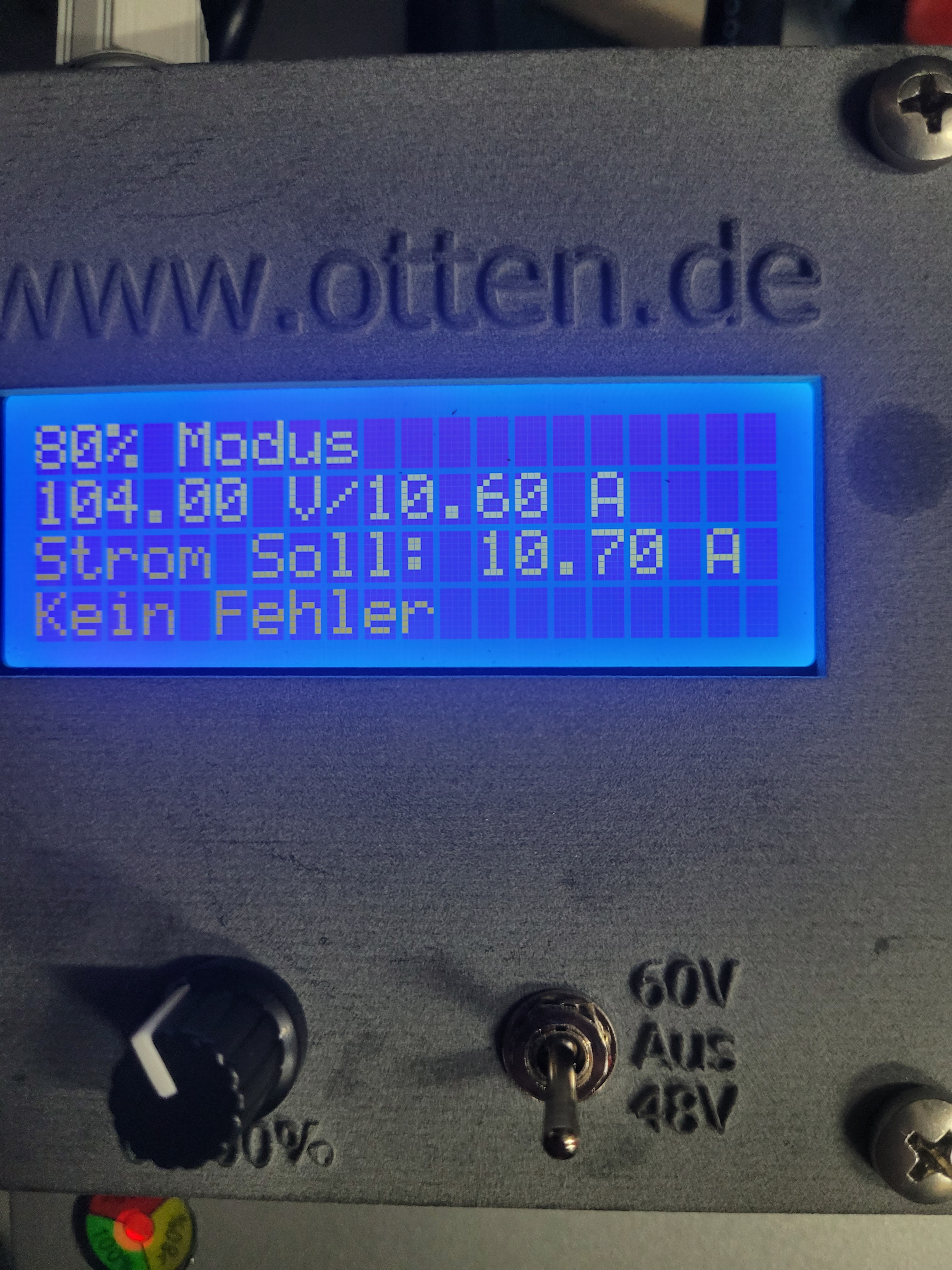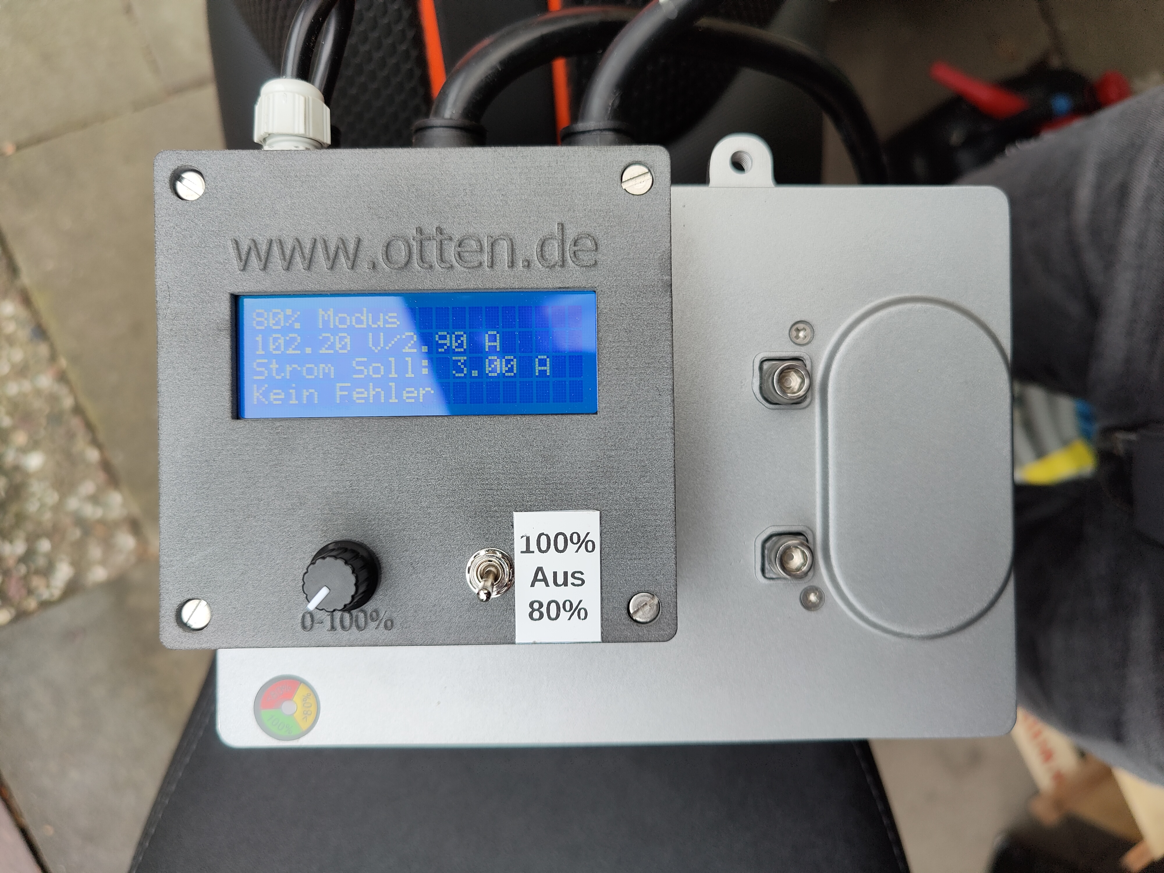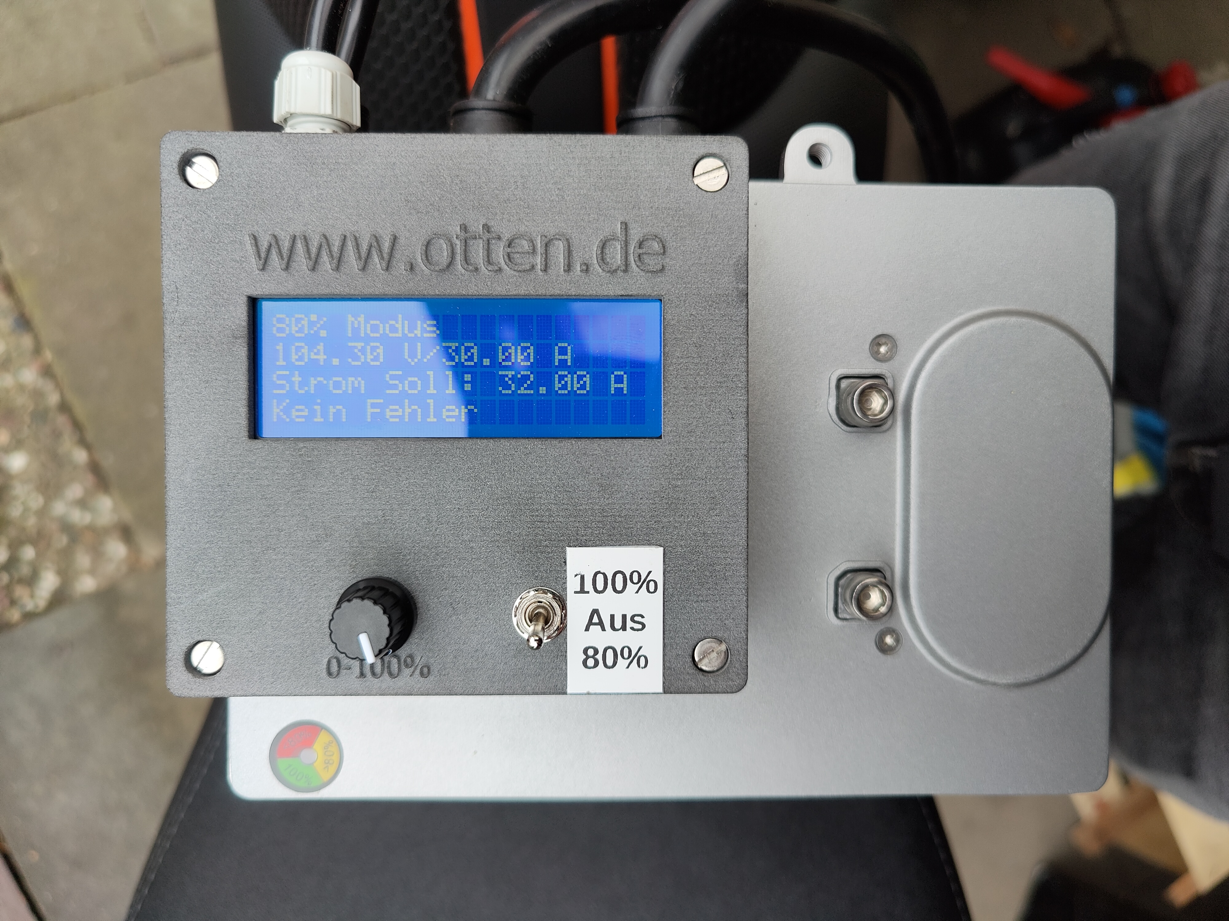 Habe heute mein Einstellbares Otten Ladegerät geliefert bekommen, Tip top das Teil. Genau das was ich mir vorgestellt hab, die Ausgangsleistung lässt sich von 3-32A einstellen. Der 80% Schalter hat bei mir eine Ladung von 84% ergeben.