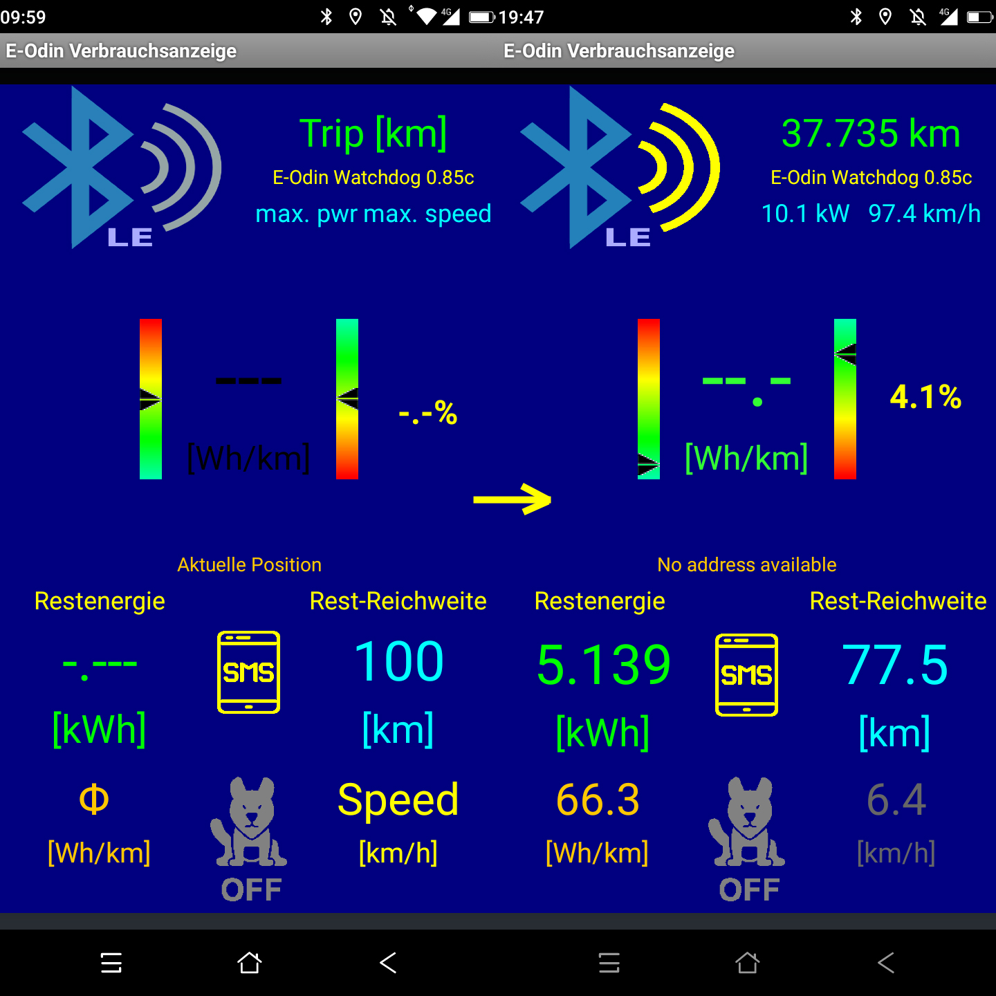 Bei meiner App mache ich das so:gdv-it hat geschrieben: Mi 13. Jul 2022, 06:52 Hast du einen Vorschlag für eine sinnvolle Restreichweitenberechnung? Der durchschnittsverbrauch der letzten 5km geteillt mit dem SOC? Der Durchschnittsverbrauch wird dann mit ein Ringbuffer dauernd nachkalkuliert? Ideen?