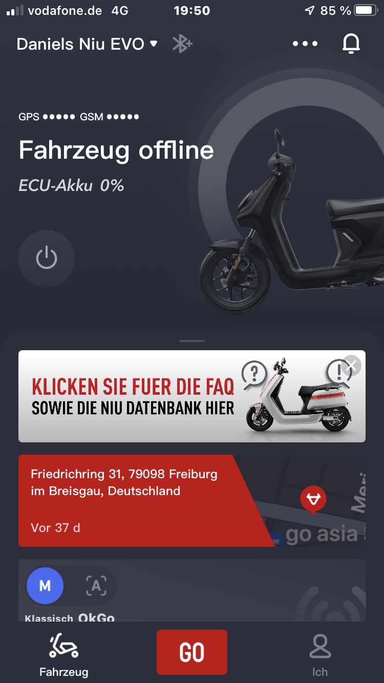 Ich glaube nicht, dass die App die aktuelle Konfiguration anzeigt, da der Roller ja offline ist. Die ECUBatterie ist auch bei 0 %. Das kann ja nicht sein, dann wäre ja keine Probefahrt möglich gewesen.