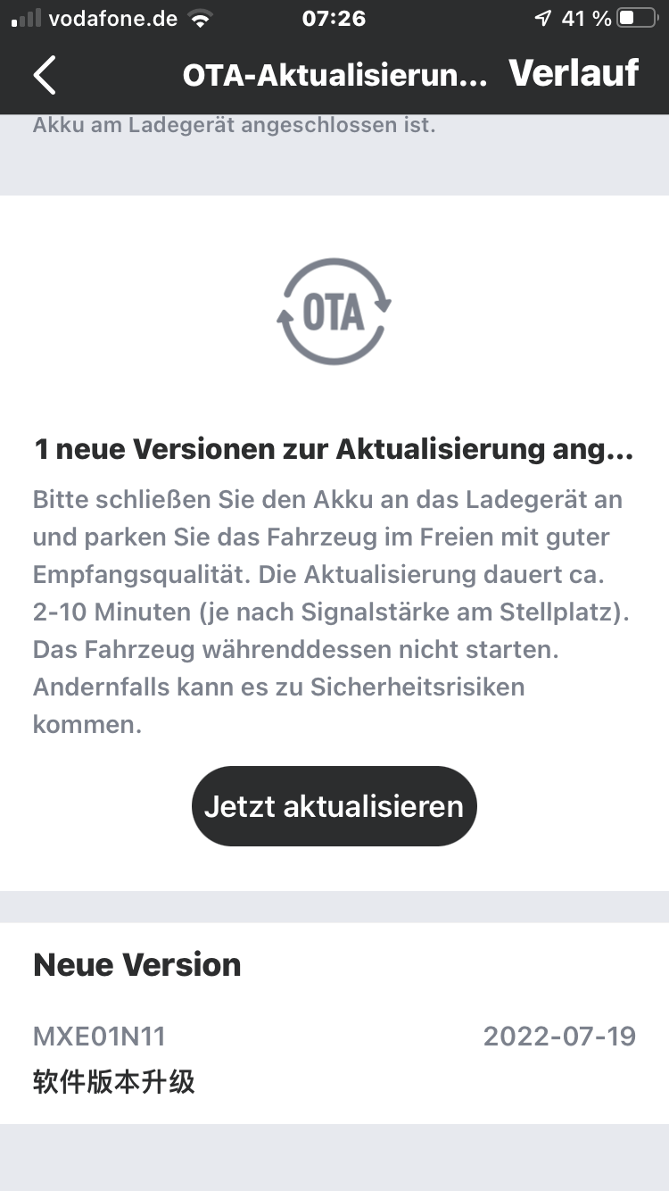 Kannst du mal schauen was in der App jetzt für eine Firmware angezeigt wird?dandylam hat geschrieben: Do 11. Aug 2022, 13:32 Gestern (10.08) erhielt ich einen Anruf meines Händlers mit der Nachricht, dass mein EVO wieder fahrbereit ist.