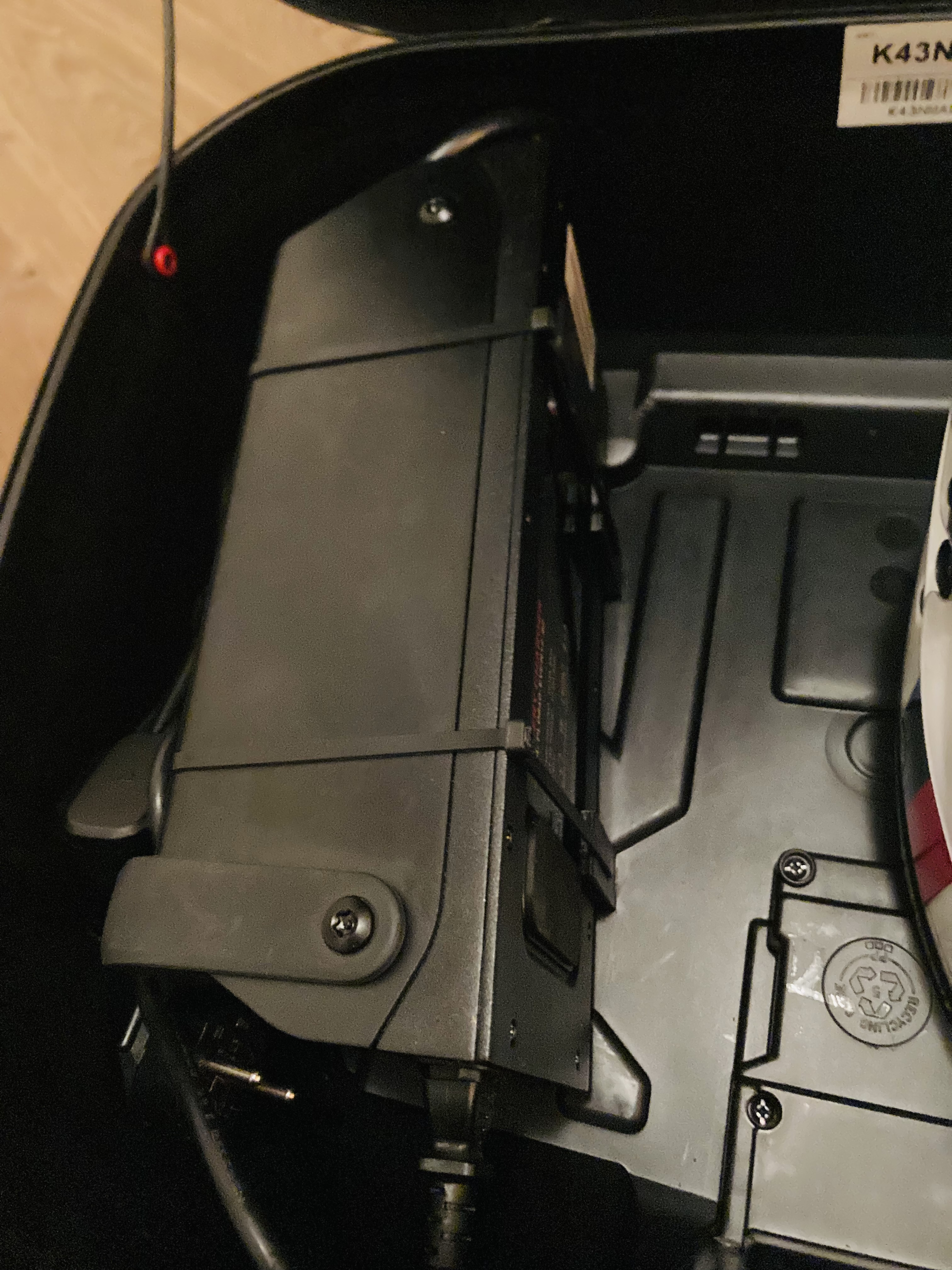 Wie bereits vom Matrix3937 beschrieben, es ist ein loser Stecker unter der Frontverkleidung, der für ein „Klappern“ beim Überfahren von Unebenheiten verantwortlich ist.