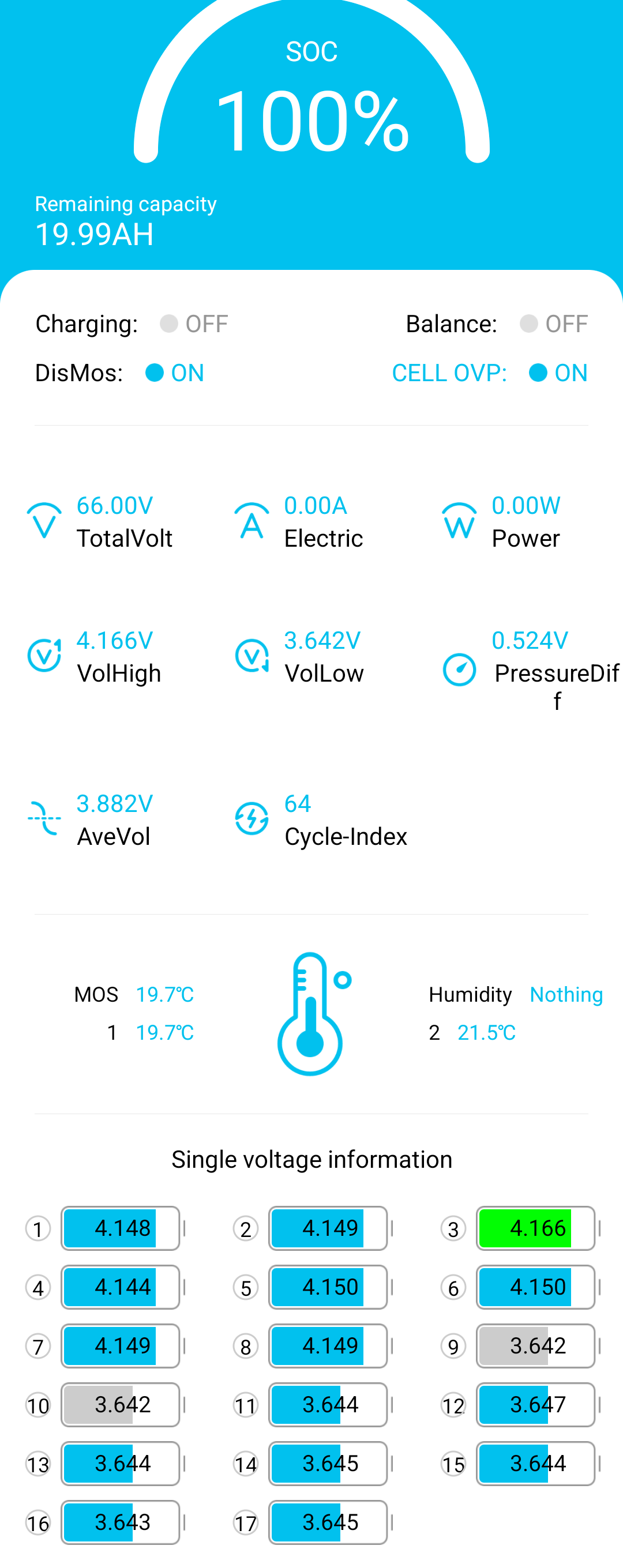 Mit einem Labornetzteil konnte ich eine Bluetooth-Verbindung herstellen und habe die folgenden Werte erhalten ( immerhin stimmt das Balancing 🫣):